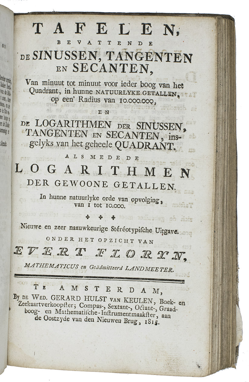 With: (2) FLORYN, Evert. Tafelen, bevattende de sinussen, tangenten en secanten, van minuut tot minuut voor ieder boog van het quadrant, in hunne natuurlyke getallen, op een' radius van 10.000.000, ... als mede de logarithmen der gewoone getallen, in hunne natuurlyke orde van opvolging, van 1 tot 10.000.