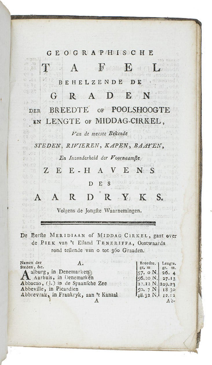 Ad 3: Geographical work with the longitude and latitude of the most important cities, rivers, capes, bays and ports of the earth, which perhaps brought some practical and efficient help when one tried to navigate at sea. It is added by S. Hollander, as the preface of the Schat-kamer says, as a useful appendix to the more mathematical navigation manuals to make it a complete guide for 18th-century sailors.