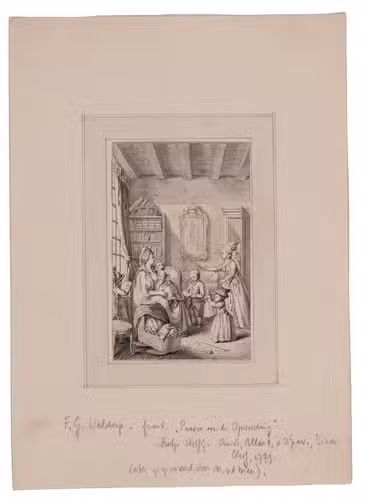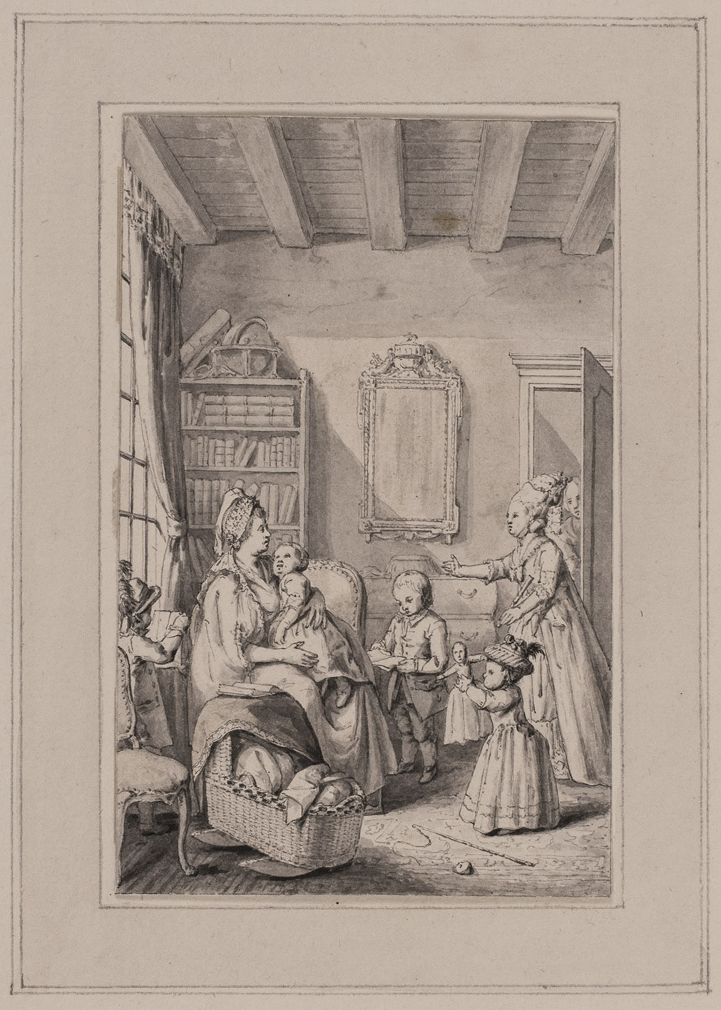 Attractive design in black ink with grey washes by Jan Gerard Waldorp, for the frontispiece of Betje Wolff's pedagogical essay Proeve over de opvoeding (1779). The drawing shows a lady entering a room where a mother is sitting with a baby, a cradle beside her, and several other children in the room reading and playing, with a bookcase in the background, with a globe on top. Noach van der Meer the younger engraved the frontispiece after this drawing, and Allart in Amsterdam published the book jointly with Isaac van Cleef in The Hague in 1779. The essay is the only pedagogical work of the important eighteenth-century Dutch women writers duo Wolff and Deken. Wolff (1738-1804) discusses the importance of the mothers role in raising children: a mother should read a lot to educate her children in a broad range of subjects and she should not tell, or let her children read, foolish folk tales, but instead present them with stories from the Bible, classical antiquity and Dutch history.