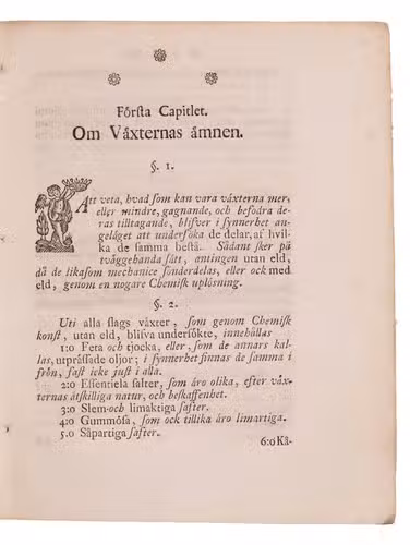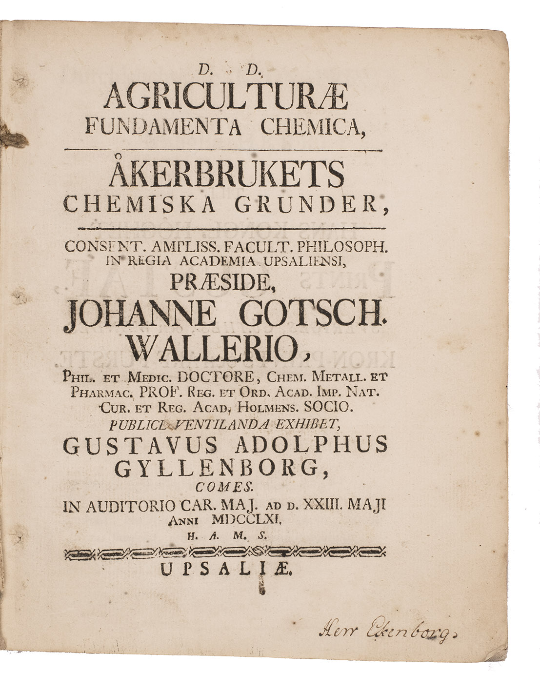 First edition of a thesis on the role of chemistry in the development of agriculture, by the Swedish Count Gustaf Adolf Gyllenborg (1743-1789) and with the Swedish chemist and mineralogist Johan Gottschalk Wallerius (1709-1785) as praeses. It established the notion that the chemical composition of both the plants and the soil were to be comparatively studied, which became the basic principle of agricultural chemistry. "In accord with the utilitarian tendencies of the time, Wallerius, as professor of chemistry, was called upon to show what his knowledge could contribute to economic social life. ... Wallerius' interest in agriculture naturally led him to pursue agricultural chemistry, especially since agriculture was of great importance for the national economy. His research proved so basic and of such scope that he was called the father of agricultural chemistry" (DSB). The text is included in Latin with the Swedish text on the parallel page.