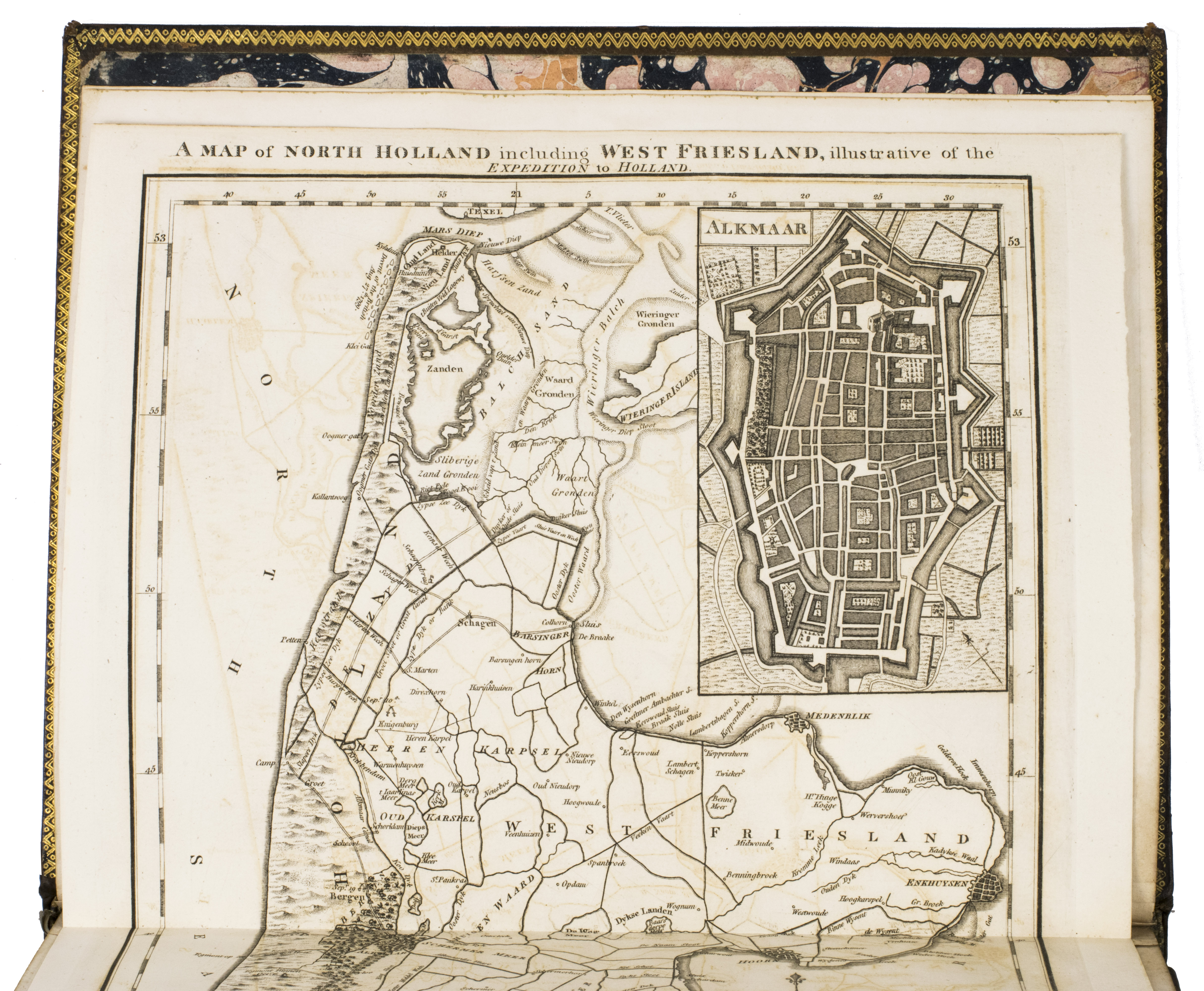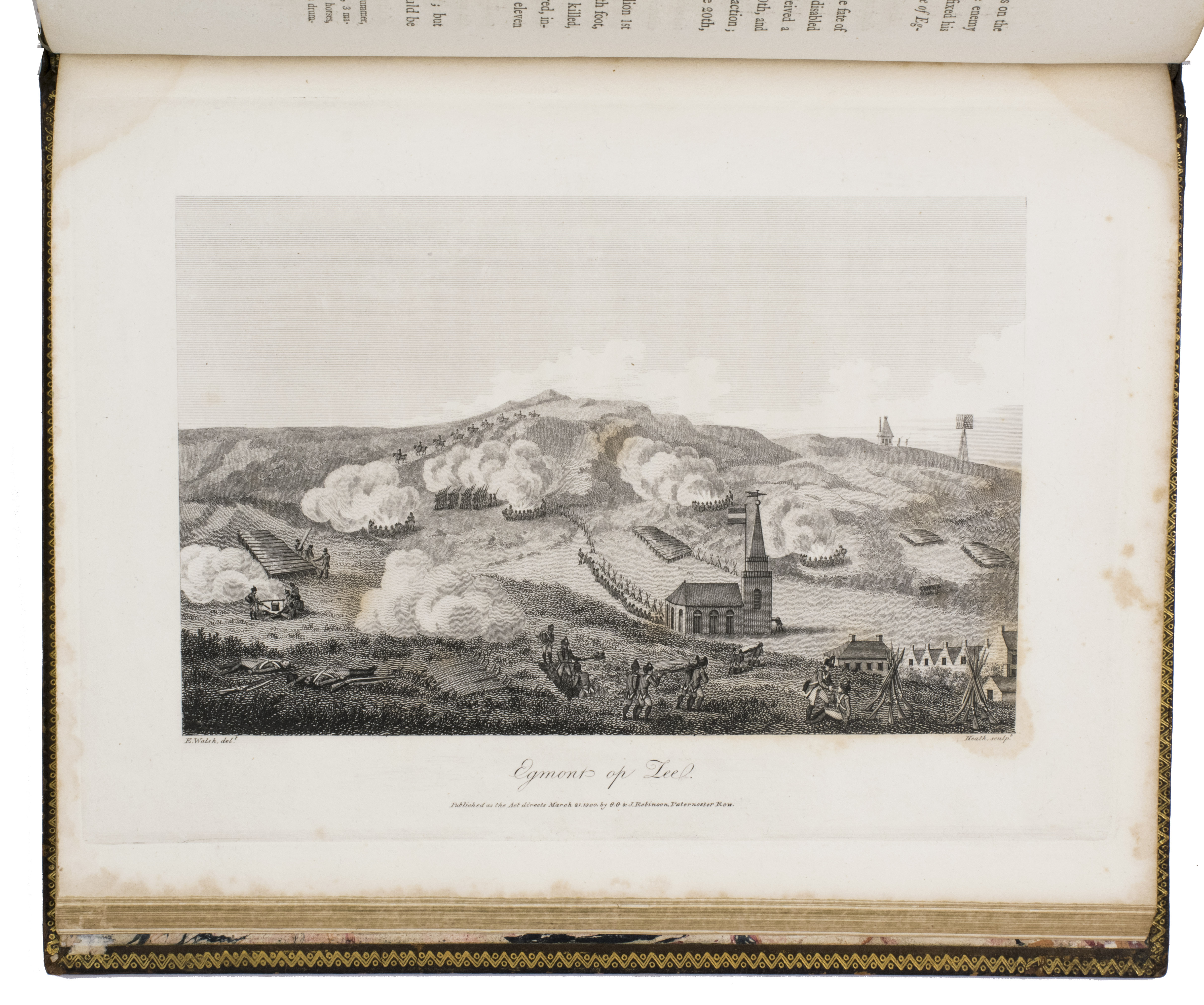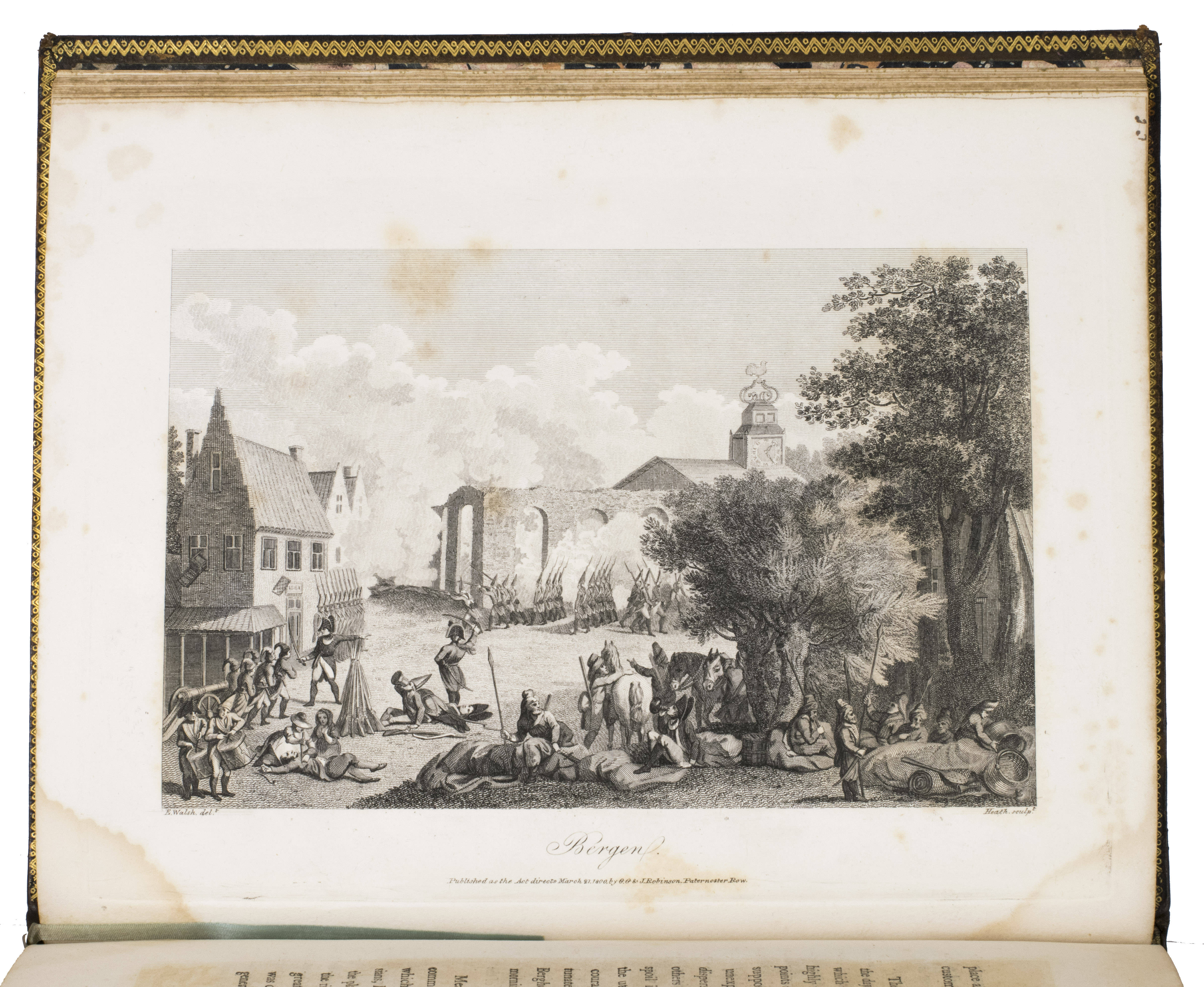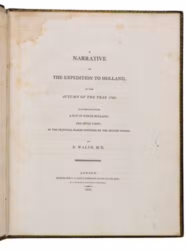 Rare first edition of an illustrated account of the Anglo-Russian invasion of North Holland in August 1799. In the so-called Helder Expedition, Russian and English troops attempted to restore the stadholderate to the House of Orange and liberate the Low Countries from the French invaders. They fought several battles, but were defeated in the Battle of Castricum after an unexpected attack. The English and Russian troops were forced to retreat and left North Holland in October of the same year. The present work offers an account of these two months of fighting, including tactical information and letters from the commanders. The plates show views of Den Helder, Oude Sluis, Schagen, Bergen, Alkmaar, Egmond aan Zee and Egmond op den Hoef, where the battles took place.
