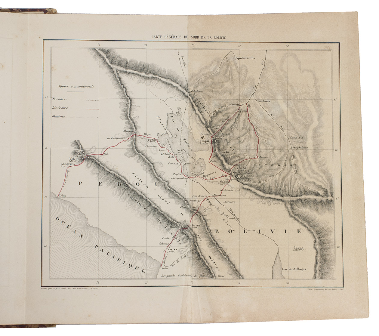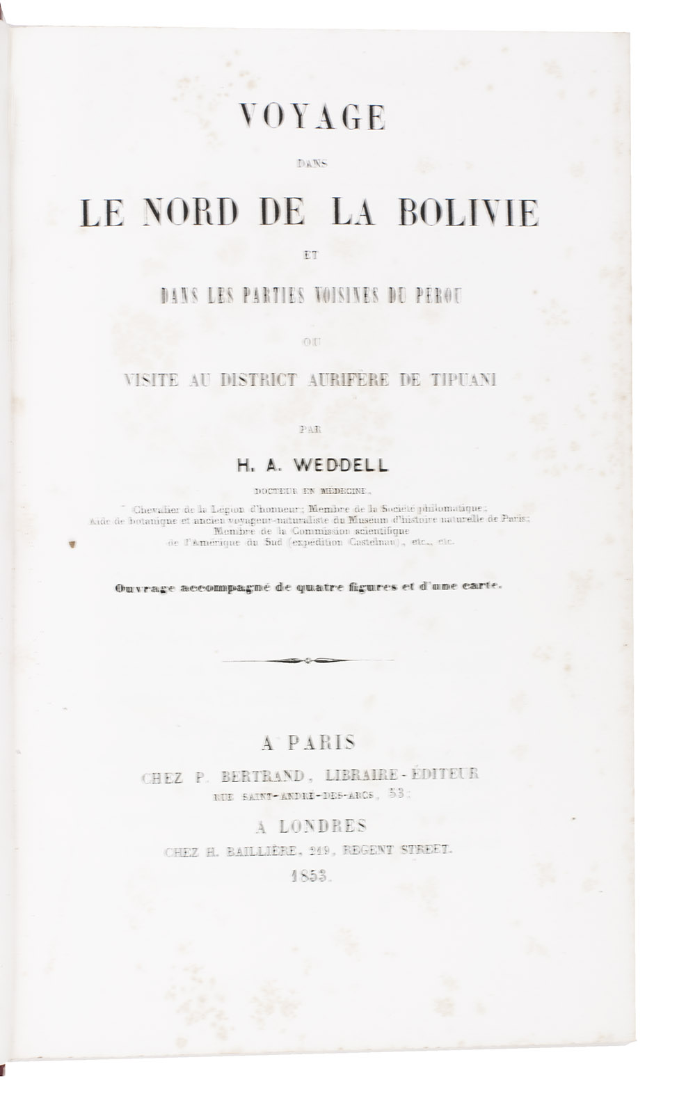 Binding lightly worn at the extremities, spine with two damp marks. Some foxing throughout; a very good copy. Hemsley & Pearson, "Plants from the Bolivian Andes", in: The Journal of the Linnean Society. Botany XXXV (1904), p. 79; René-Moreno, Biblioteca Peruana, 1752; "South American travel and literature", in: Blackwood's magazine LXXIV (1853), pp. 140-158; Troelstra, Bibliography of Natural History Travel Narratives, p. 451; not in Borba de Moraes; Numa Broc.