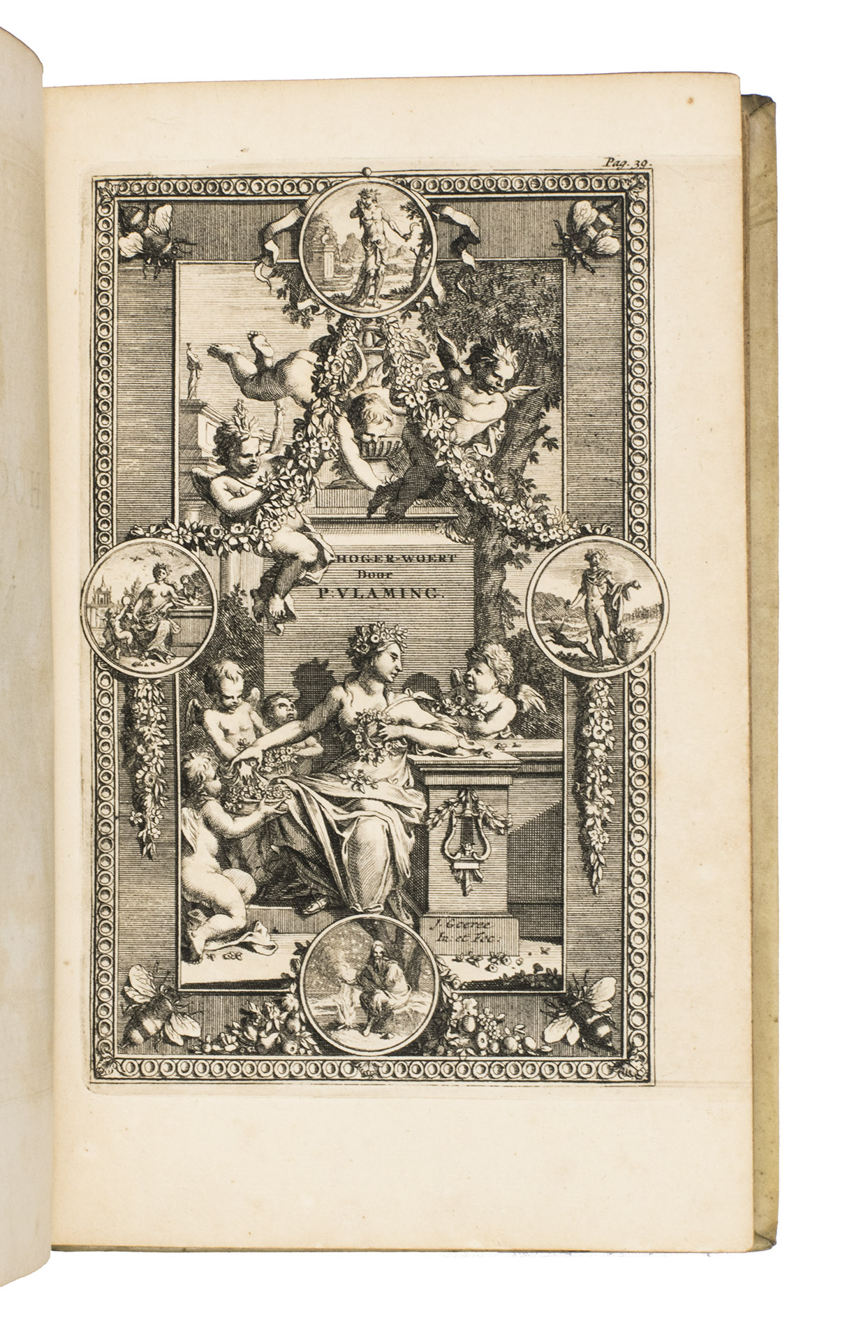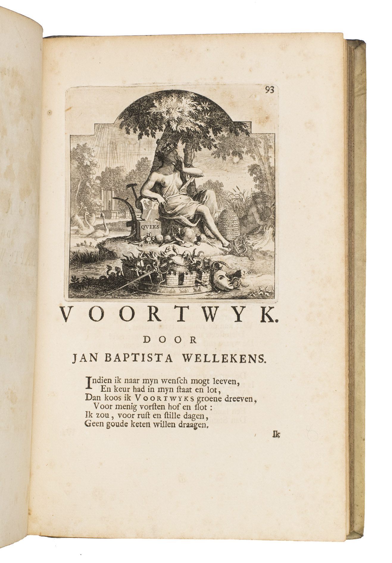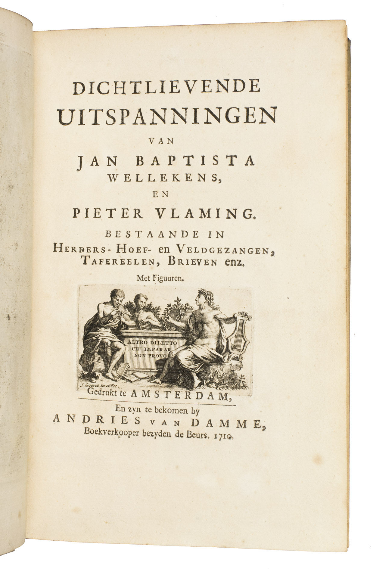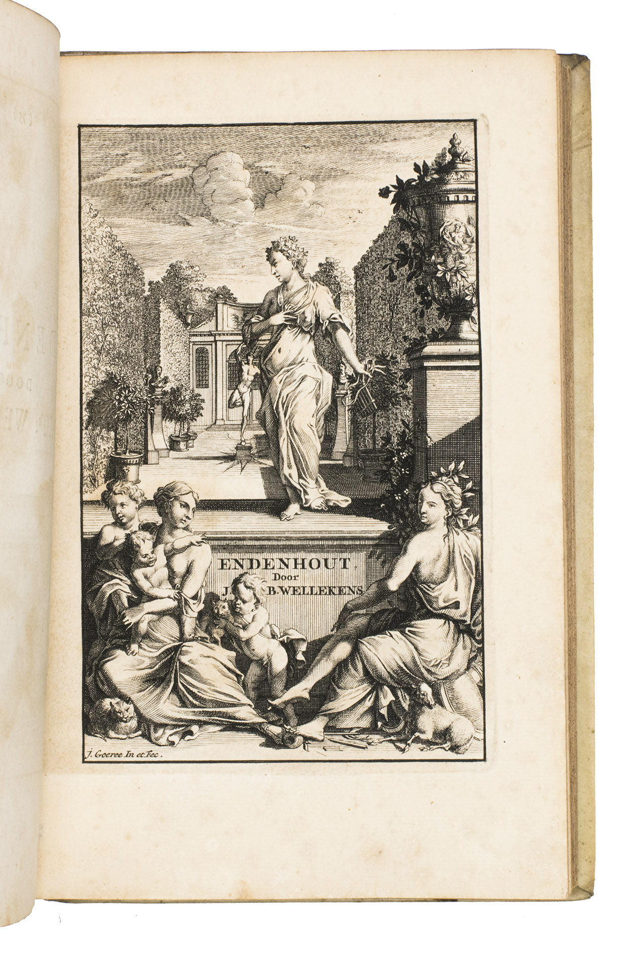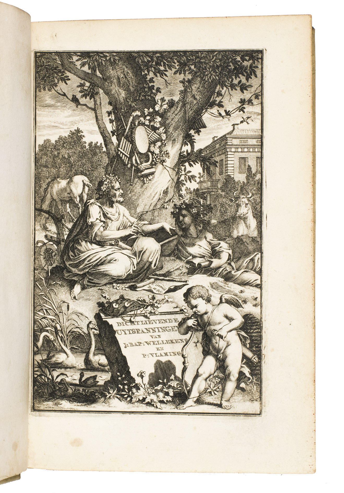 First edition of Wellekens and Vlaming's collection of georgic poetry, illustrated with engravings by Jan Goeree. Most of the poems are on gardens, fishing, ruins, arts, etc. It contains laureate poems on the outdoor places Hoogerwoerd and Eindenhout., and Vlaming's description in rhyme of five allegorical paintings made by Barent Graet in the house of his mother in law Agnes Block, which are also depicted, and eight heroic poems. The second edition, which was in fact a title-issue, was published in 1735 by Jacob ter Beek in Amsterdam.