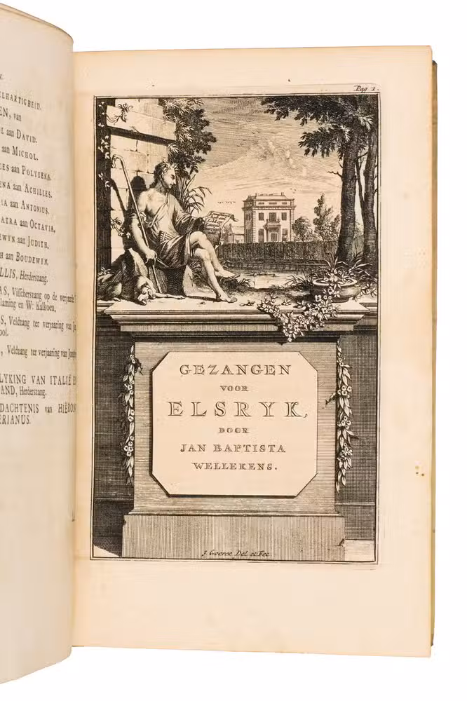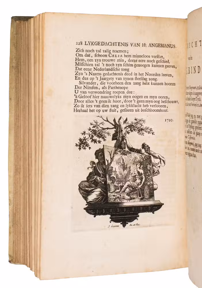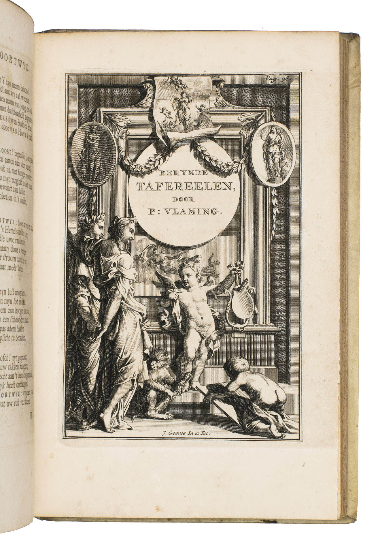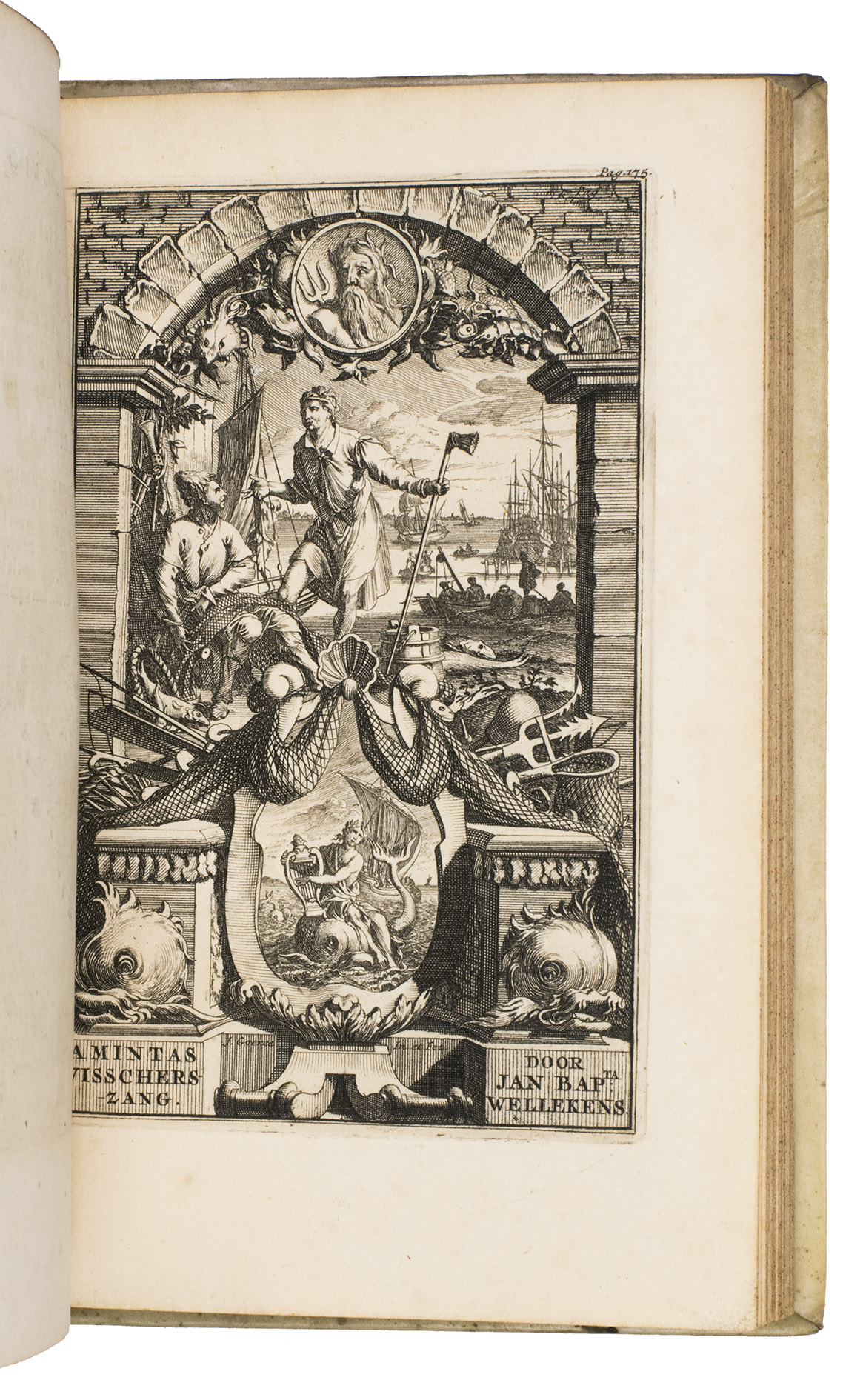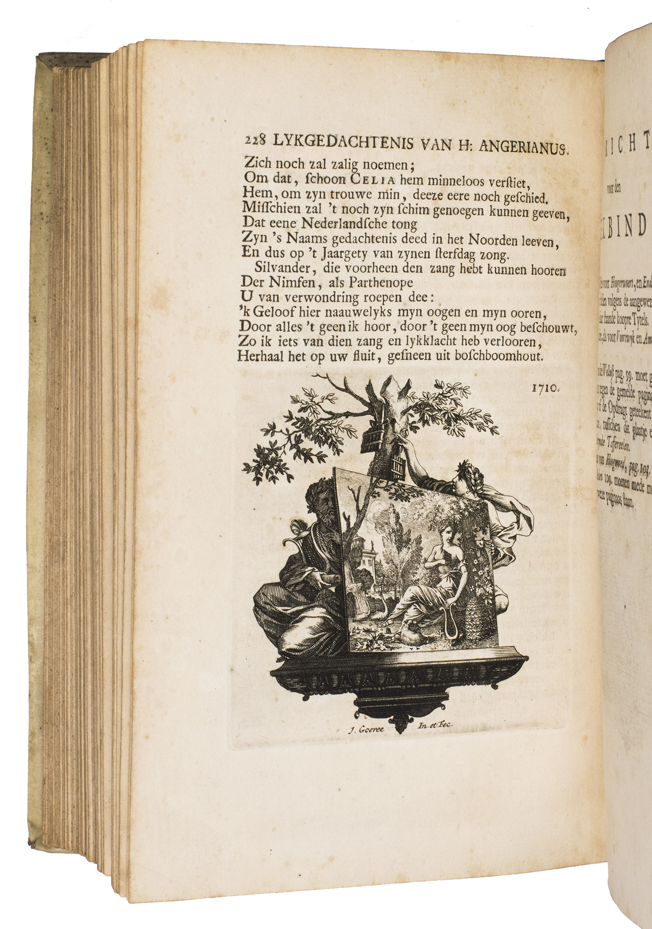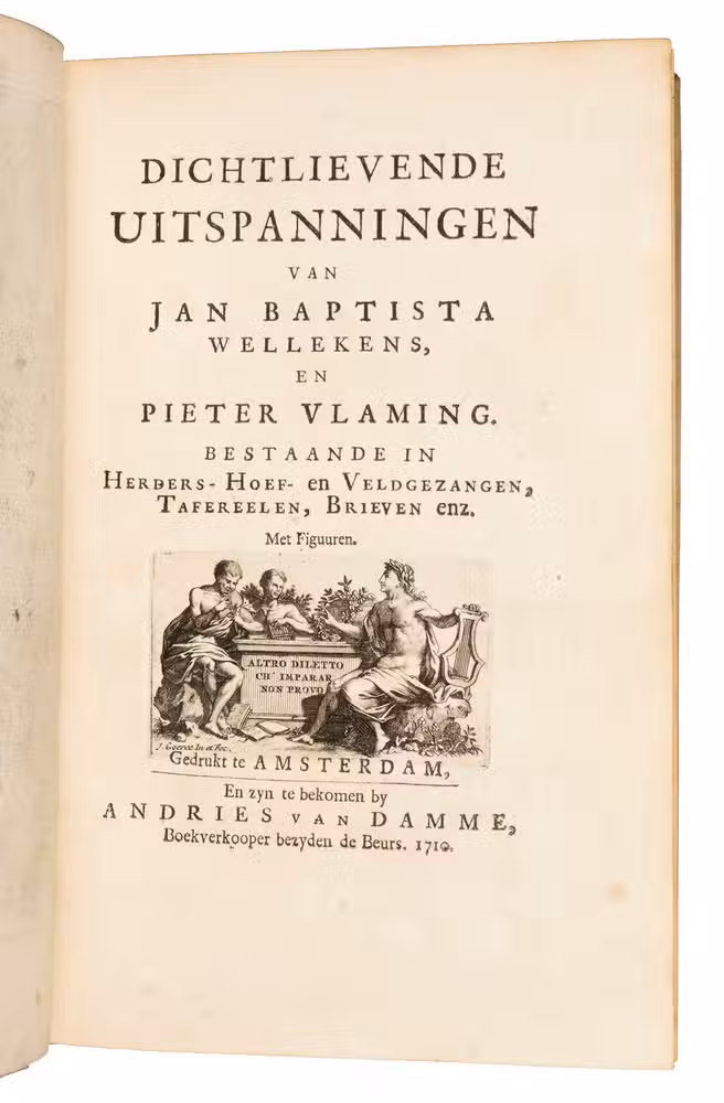 First edition of Wellekens and Vlaming's collection of georgic poetry, illustrated with engravings by Jan Goeree. Most of the poems are on gardens, fishing, ruins, arts, etc. It contains laureate poems on the outdoor places Hoogerwoerd and Eindenhout., and Vlaming's description in rhyme of five allegorical paintings made by Barent Graet in the house of his mother in law Agnes Block, which are also depicted, and eight heroic poems. The second edition, which was in fact a title-issue, was published in 1735 by Jacob ter Beek in Amsterdam.