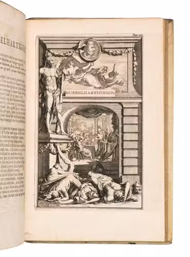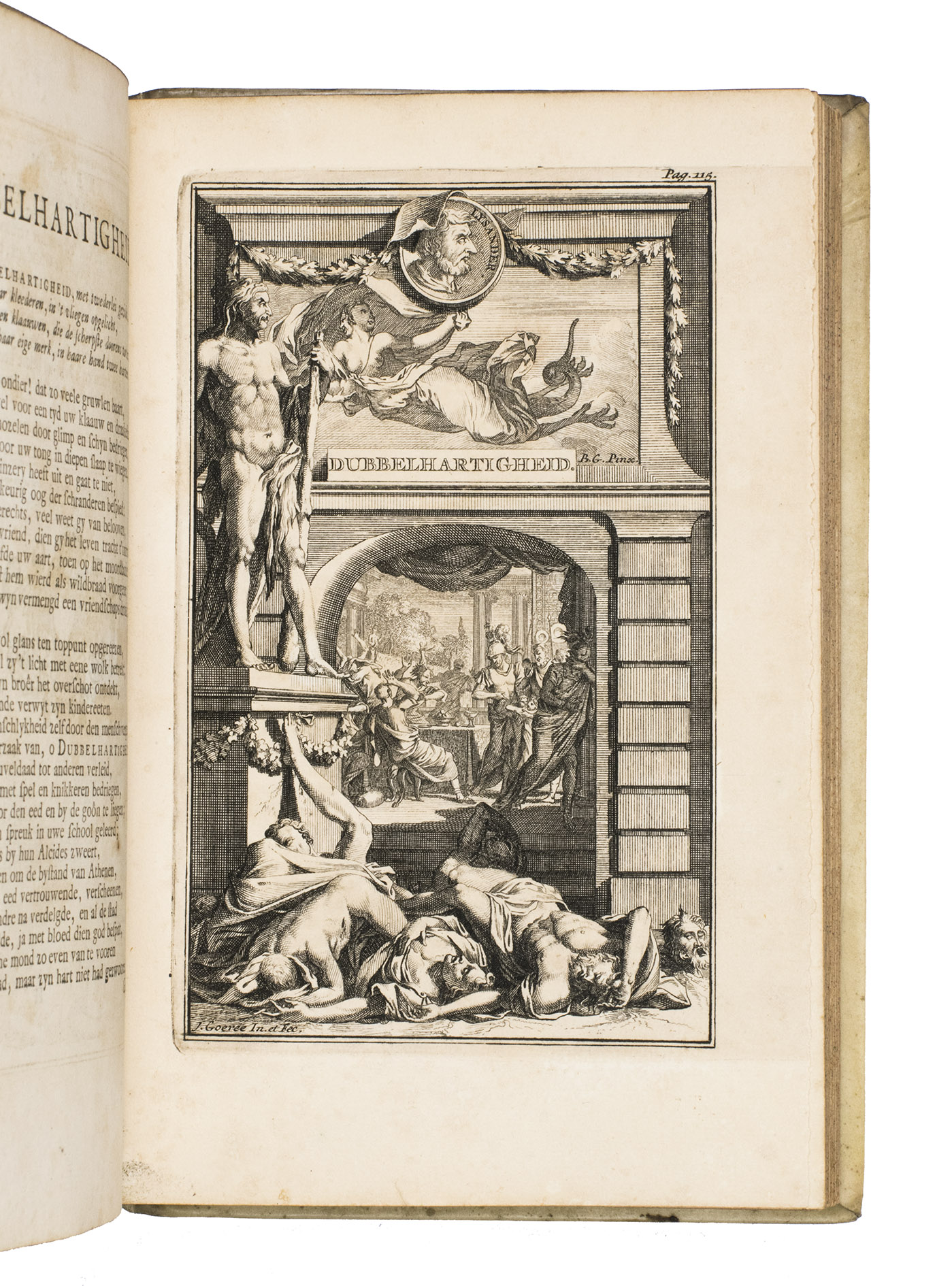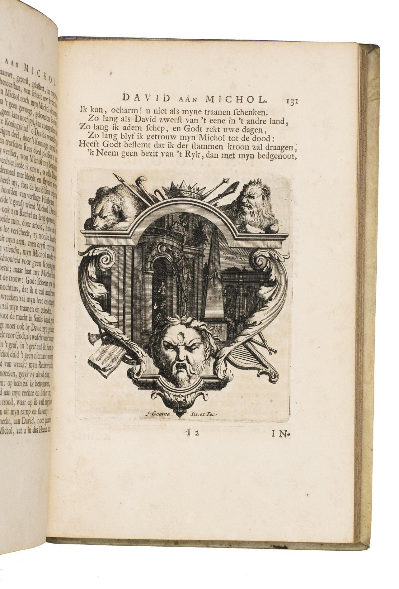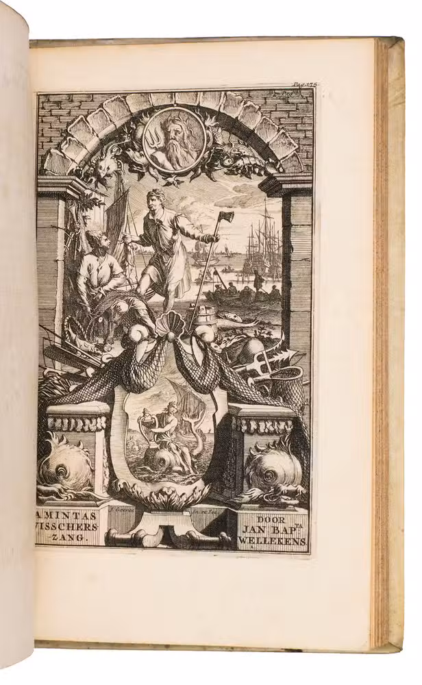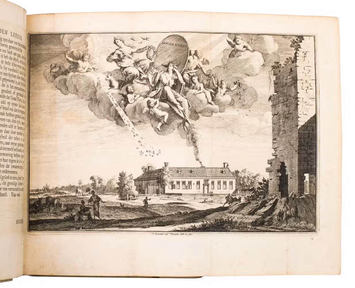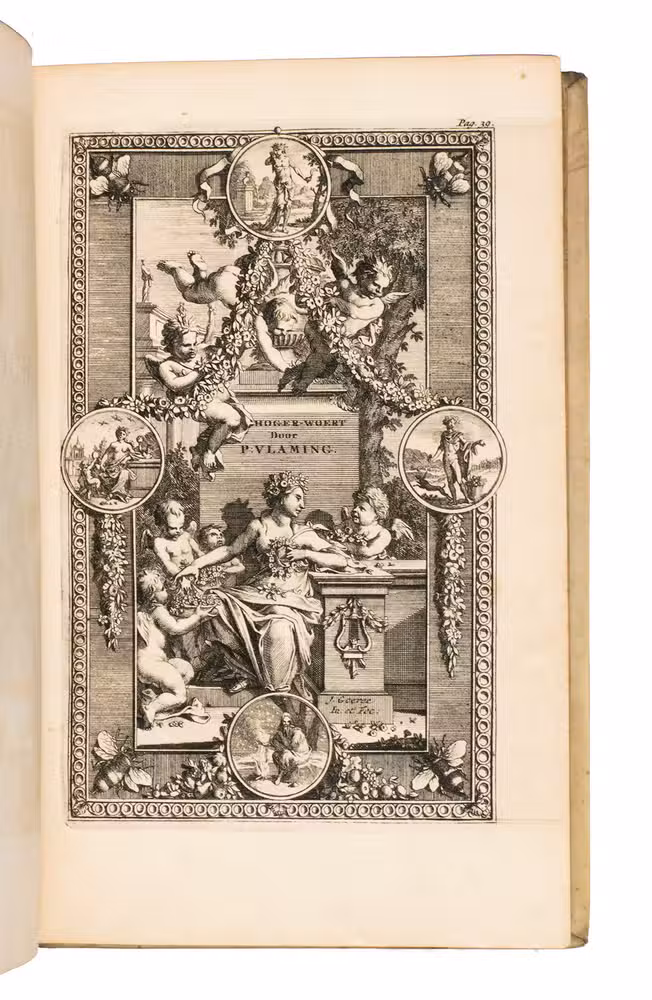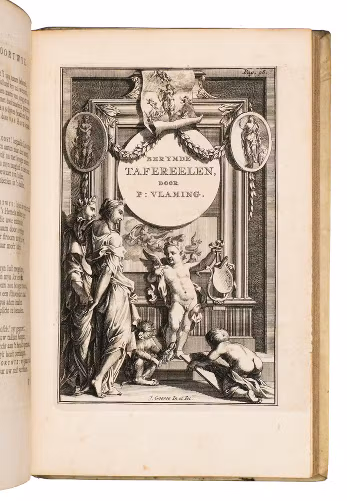 First edition of Wellekens and Vlaming's collection of georgic poetry, illustrated with engravings by Jan Goeree. Most of the poems are on gardens, fishing, ruins, arts, etc. It contains laureate poems on the outdoor places Hoogerwoerd and Eindenhout., and Vlaming's description in rhyme of five allegorical paintings made by Barent Graet in the house of his mother in law Agnes Block, which are also depicted, and eight heroic poems. The second edition, which was in fact a title-issue, was published in 1735 by Jacob ter Beek in Amsterdam.