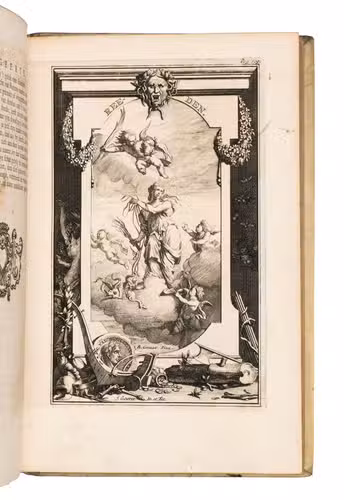 Amsterdam, sold by Andries van Damme (colophon: printed by Willem Goeree the younger), 1710. 8vo. With an engraved frontispiece, an engraved vignette on the title page, 7 full-page engraved part-titles, 7 engraved plates (1 folding, 6 full page), 16 engravings in the text, several woodcut endpieces and initials; all engravings by J. Goeree. Contemporary vellum with the manuscript authors on the spine, sewn on 4 supports laced through the joints, red and blue sprinkled edges. [16], 228, [2] pp.