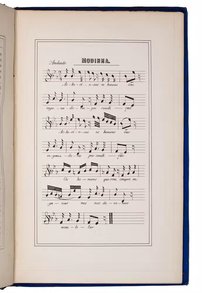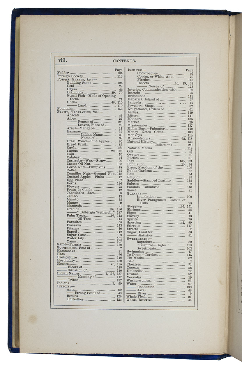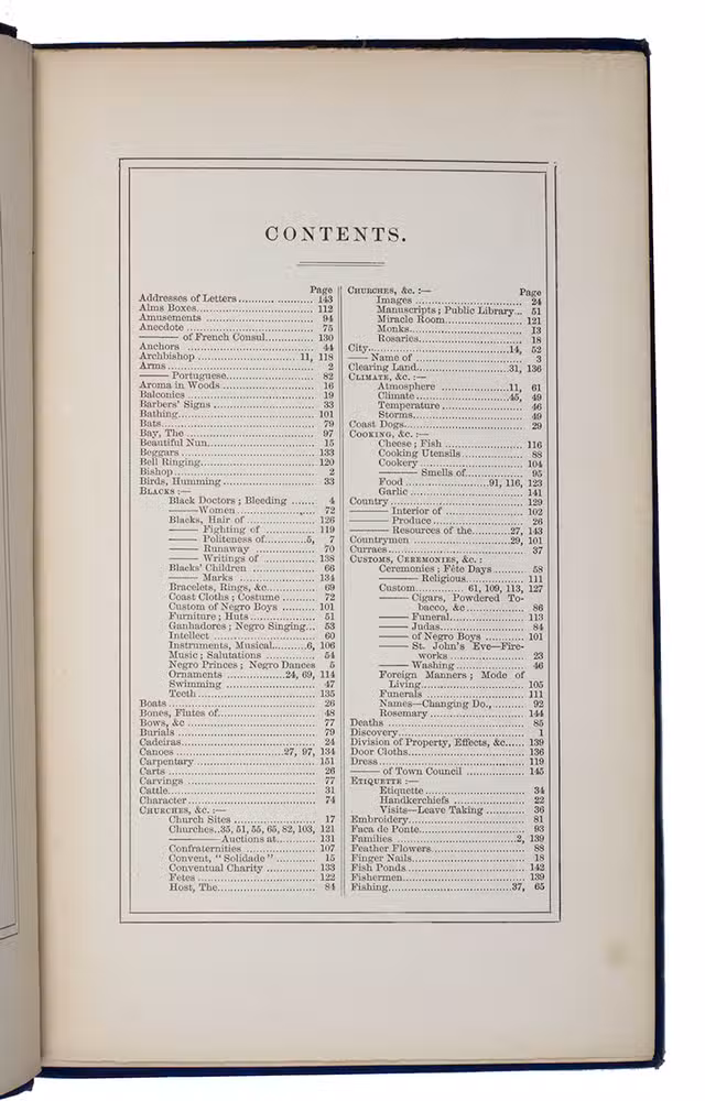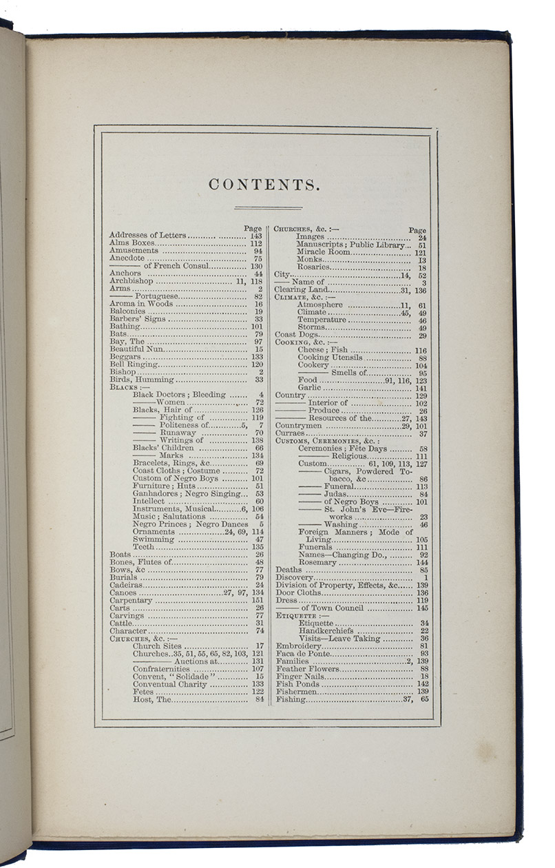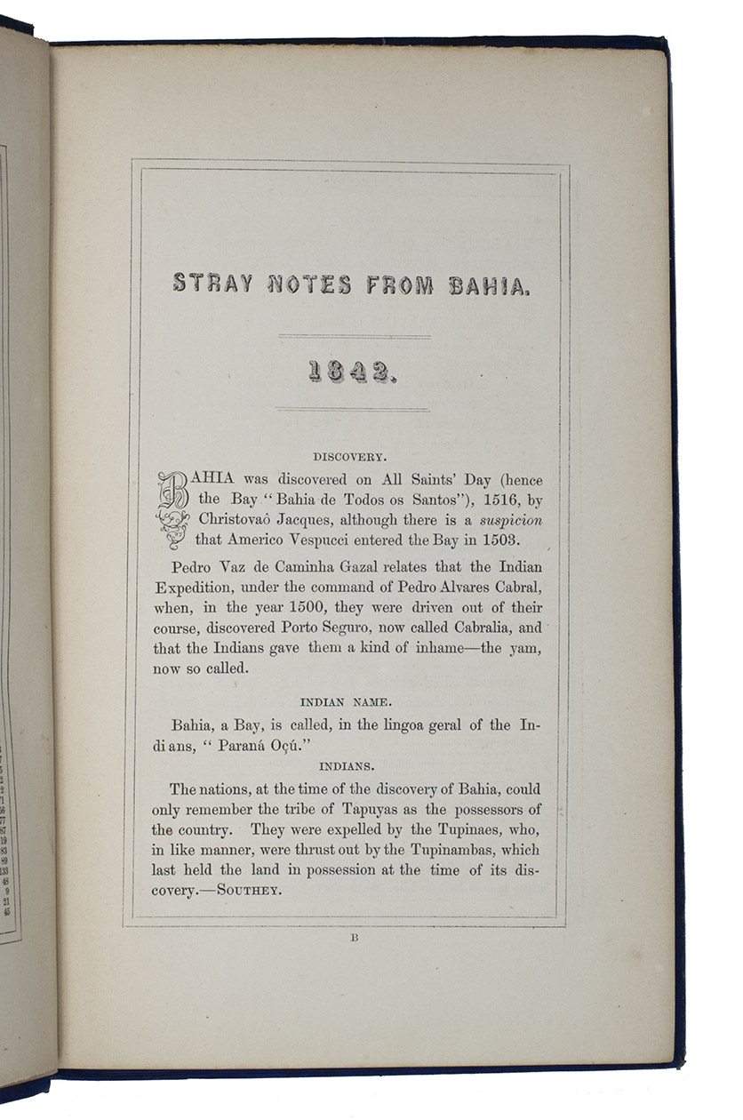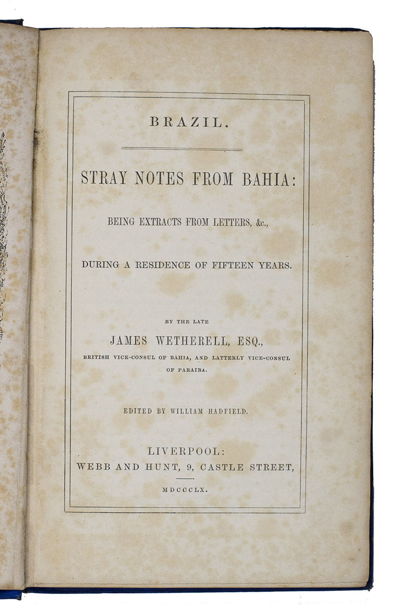First edition of Wetherell's extensive description of life in Bahia during the Second Empire (1840-1889) under Dom Pedro II. James Wetherell (1822?-1858) was a British businessman who lived in Bahia for 15 years beginning in 1843, serving as British vice consul (1843-1857). In short notes, he wrote about many aspects of Brazilian life, people and customs as religion (churches, convents, religious functions, ceremonies), means of transport (boats, canoes, carts), politics and economy, slavery, food and cooking, etiquette, fishing. He also describes largely natural historical aspects such as flora, horticulture, fruits, fossils and shells, insects and different mammals and birds. Besides this, Wetherell discusses Brazilian music and includes a lithographed sheet of music of a contemporary popular song. His many notes dating from 1852 to 1857 are considered to be very accurate and give a vivid and very good exemplary description of life in Bahia during the Second Reign, covering many different topics. The book is rarely offered for sale, the last two copies being at auction at 2019 and 1985.