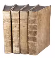 The Hague, widow of E. Boucquet, H. Scheurleer, F. Boucquet, J. de Jongh, 1729 (vols. 1-3); Dordrecht, Ab Blussé & son, 1769 (vol. 4). 4 volumes. 4to. With an engraved frontispiece, title-pages in red and black and with engraved vignettes, a folding portrait of Willem Karel Hendrik Friso (1711-1751), Prince of Orange and from 1747 hereditary Stadtholder Willem IV, a portrait of the author, 40 engraved plates by Houbraken with multiple portraits of artists on each plate, 1 plate with a night scene, 1 mezzotint and 118 engraved vignettes. Contemporary blind-tooled vellum with manuscript titles on spines. Sprinkled edges. [16], 412, [6]; [4], 412, [6], [4], 446, [4].