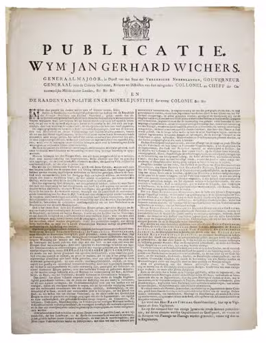 Publicatie. Wy Mr. Jan Gerhard Wichers. Generaal Majoor, in dienst van den Staat der Vereenigde Nederlanden, Gouverneur Generaal over de colonie Surinaame, rivieren en districten van dien mitsgaaders Collonel en Cheff der gezaamentlijke militie deezer landen, &c. &c. &c, en de raaden van politie en criminele justitie der voorz. colonie &c. &c.