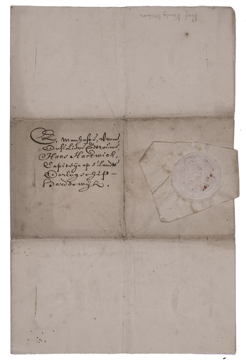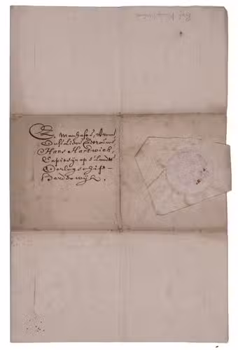 [Manuscript letter to Hans Hartwich, Capiteyn op s'landts oorlogschip Harderwijk].