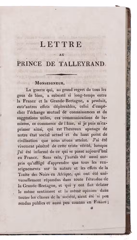 Lettre a son excellence monseigneur le Prince de Talleyrand Périgord,... au sujet de la traite des negres.