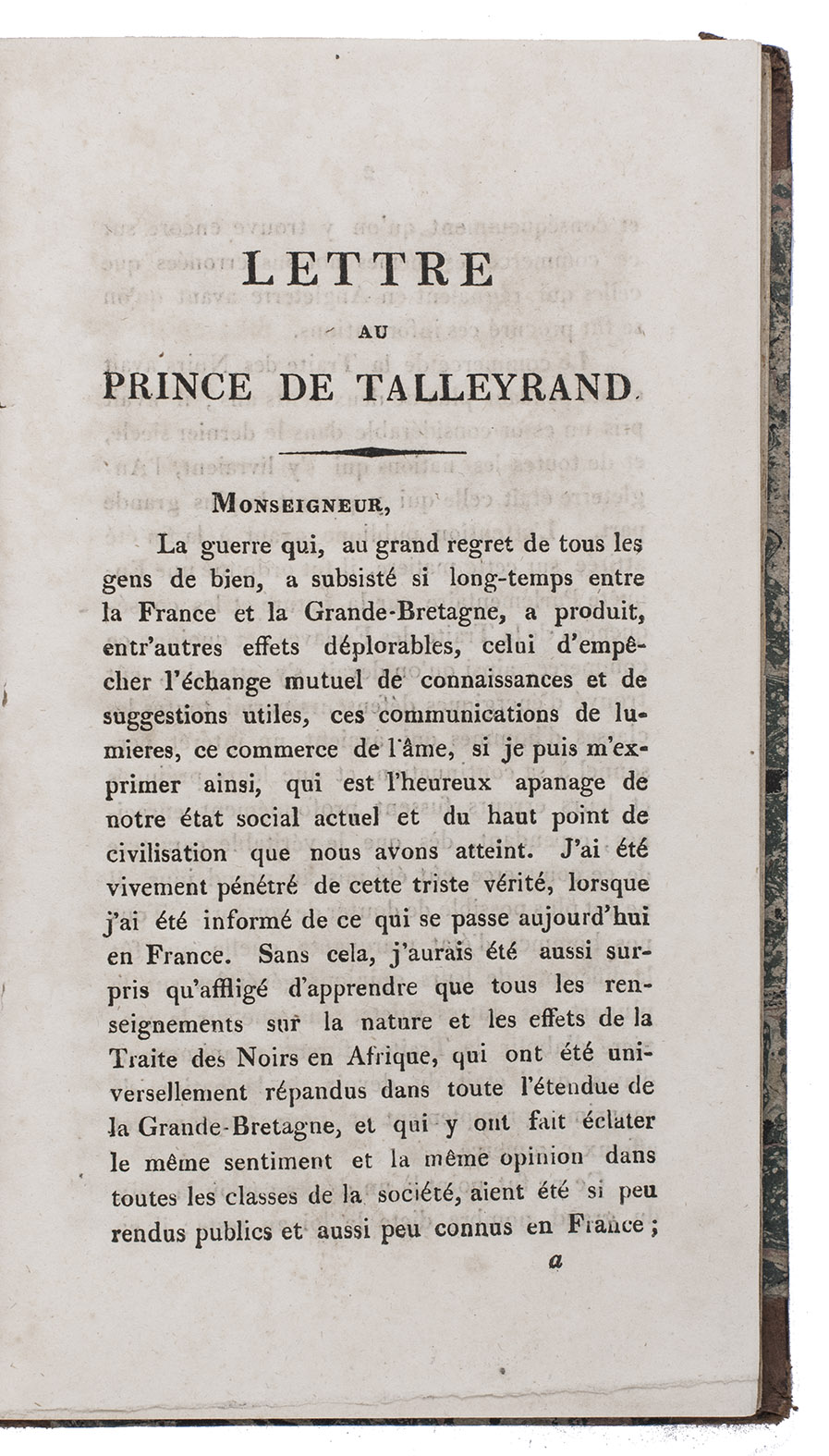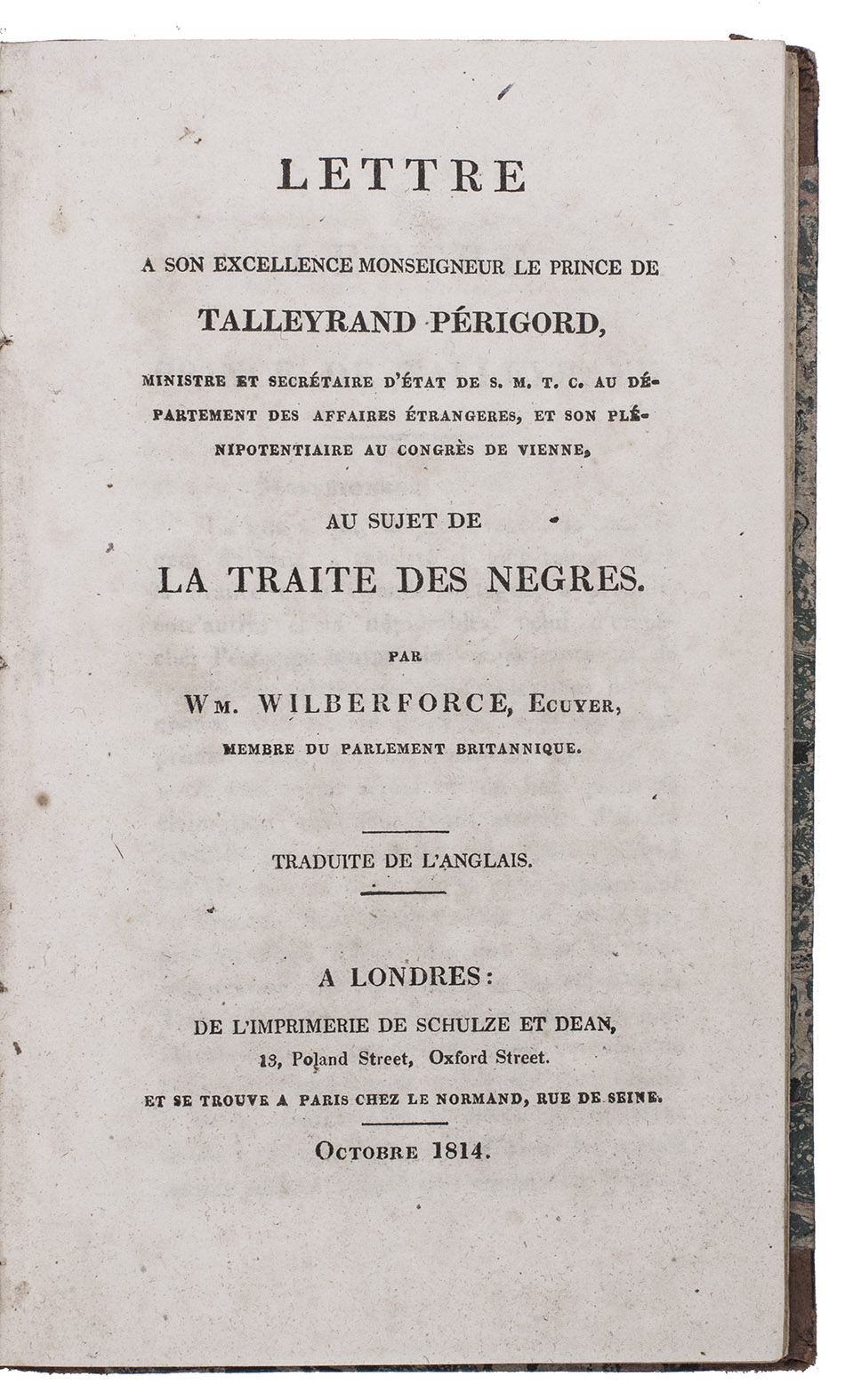 First edition of the French translation, published simultaneously with the original English, of an open letter by the famous English abolitionist William Wilberforce (1759-1833), addressed to the French Minister of Foreign Affairs, Charles Maurice de Talleyrand-Périgord (1754-1838). Wilberforce gives in great detail the many considerations that led Britain to abolish the slave trade, hoping to persuade France to abolish it as well and even join Britain in its civilizing projects in Africa. However, France did not consent to Wilberforce's proposals and officially abolished the slave trade only in 1848. Included at the end is an appendix with extracts from various others, supporting the statements made by Wilberforce in the letter.