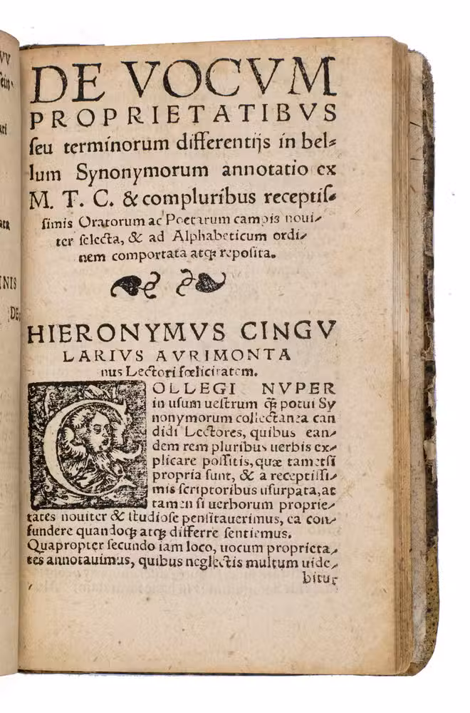 Very rare edition of one of the earliest known dictionaries of Latin synonyms, by the Silesian humanist and school-director Hieronymus Gürtel von Wildenberg (ca. 1465-1558). It was first published at Wittenberg in 1513, and proved successful, with 20 editions recorded in the USTC. The present edition is the final one, and also appears to be the rarest, as no copies have been recorded on WorldCat and only one in the USTC. We have also not been able to trace any other copies in sales records.