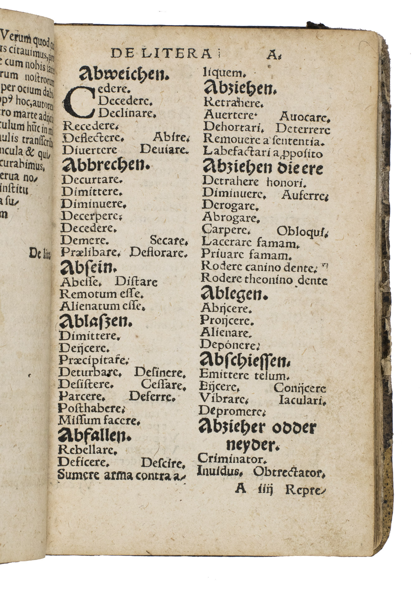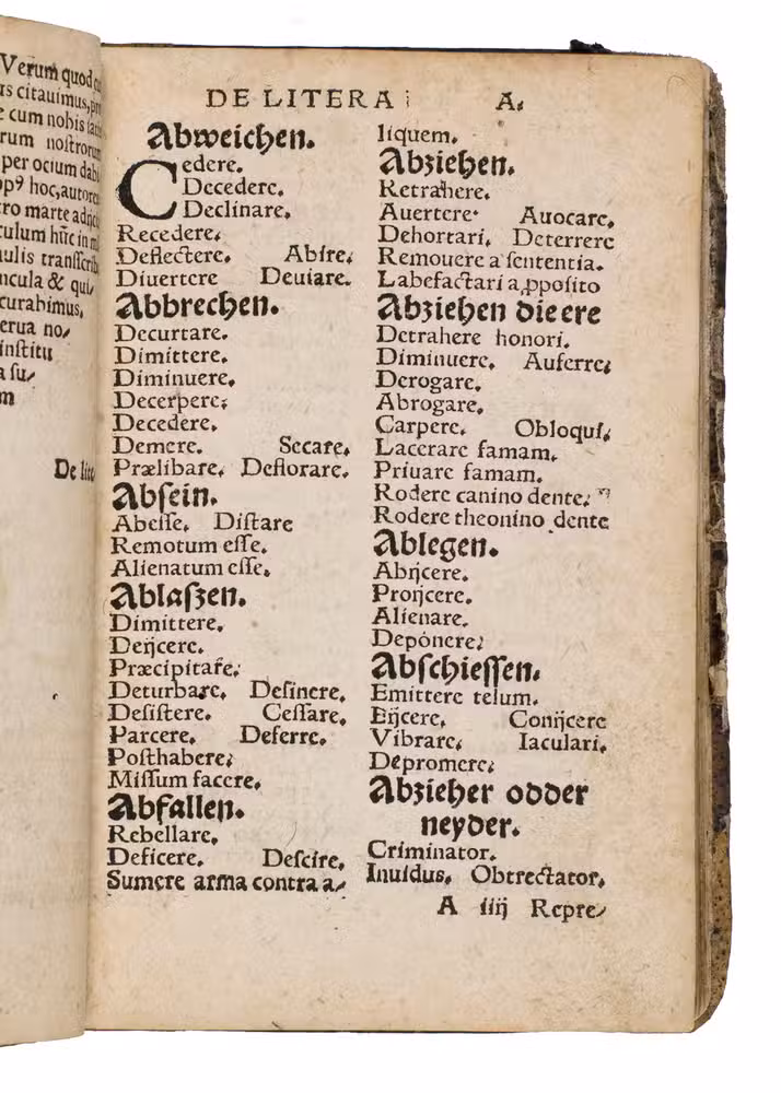 The work is divided into two parts, the first part lists words in German, alphabetically arranged, with a wide choice of Latin translations; the second part lists a large number of Latin expressions, alphabetically arranged according to the main word.