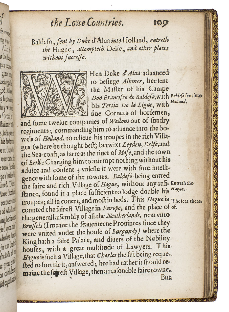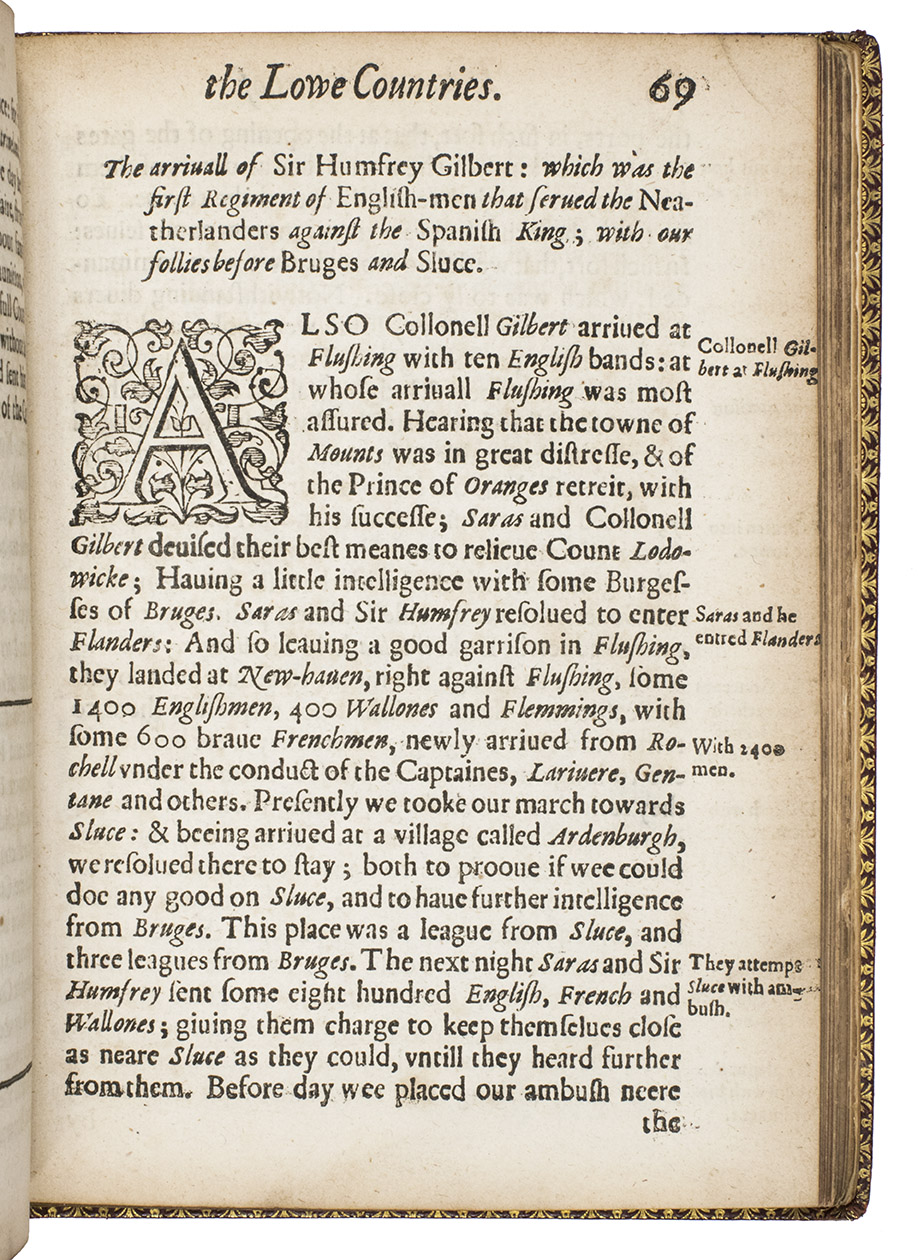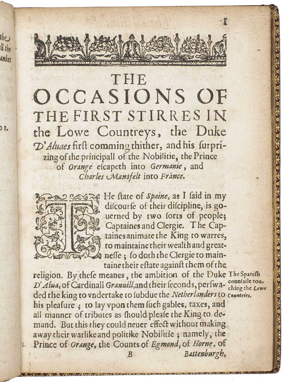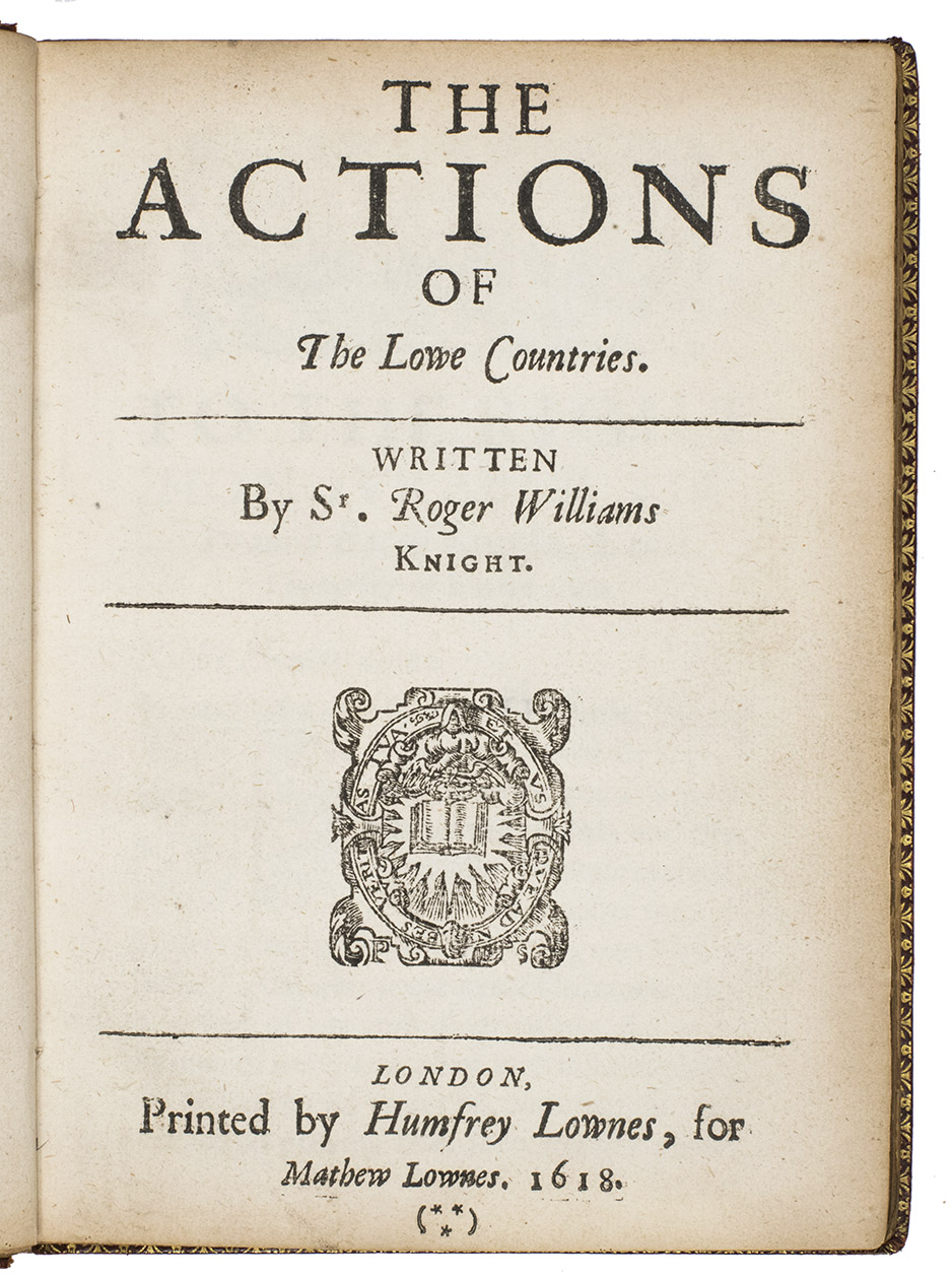 First edition of an eye-witness account of the beginning of the Eighty Year's War in the Low Countries. The author, Sir Roger Williams (ca. 1539-1595) fought under Prince William of Orange, from whom he claims to have received much information. The present work is considered a valuable and objective account. "As a Tudor historian, Sir Roger is virtually unique. Few of his contemporaries could claim Sir Roger's extensive knowledge of military science, his intimacy with the leading political and military figures of the age, and his personal experience as a soldier..." (Evans). The present copy was bound by Robert Riviere after 1880.