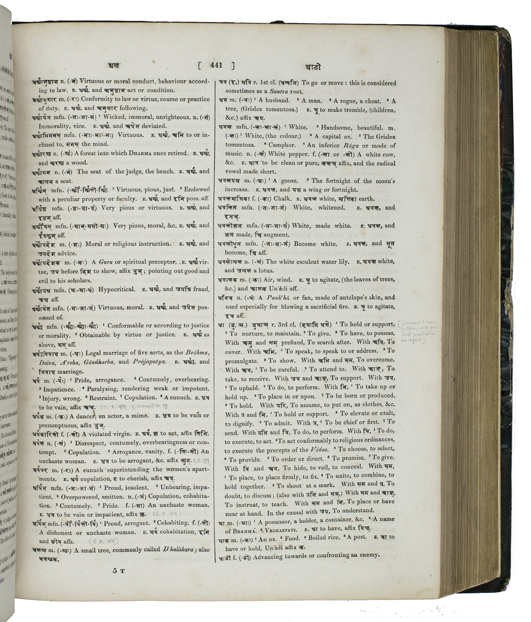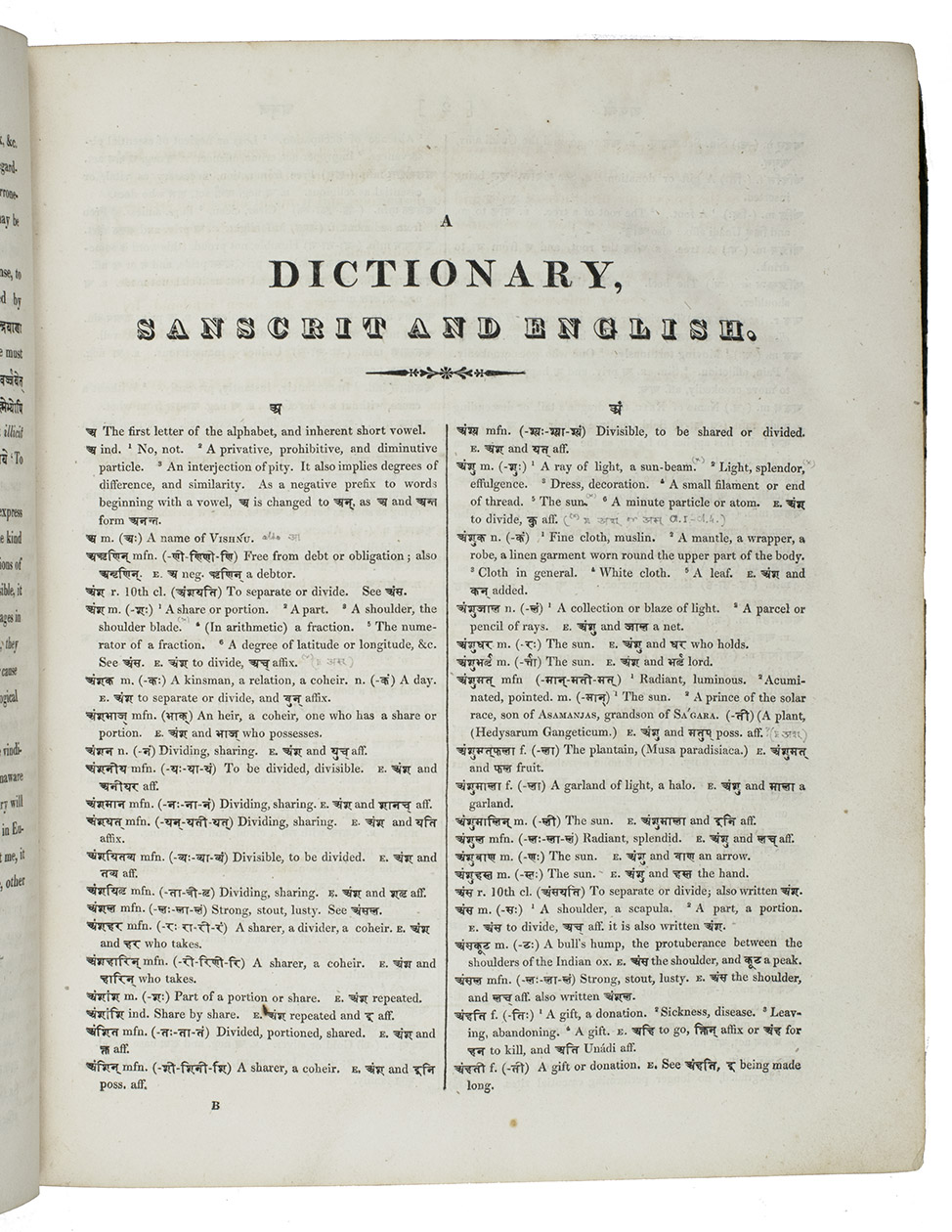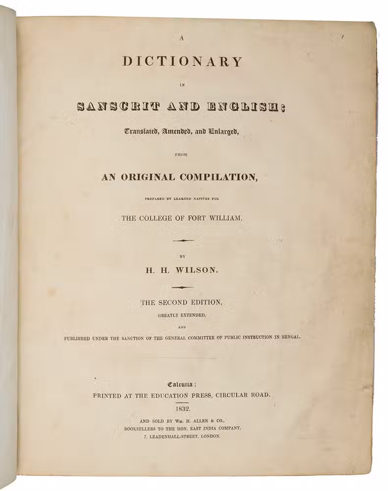 Second enlarged edition of the first etymological Sanskrit-English dictionary by the English orientalist Horace Hayman Wilson (1785-1860), originally published in 1819. The first edition was compiled from materials provided by native scholars, supplemented with Wilson's own research.