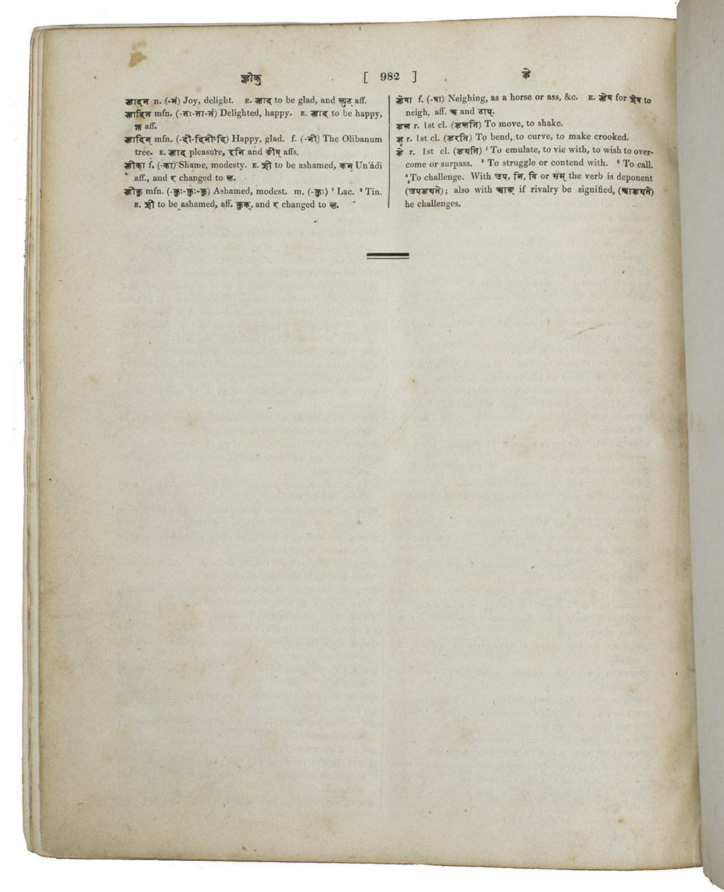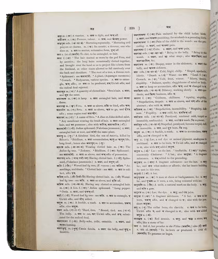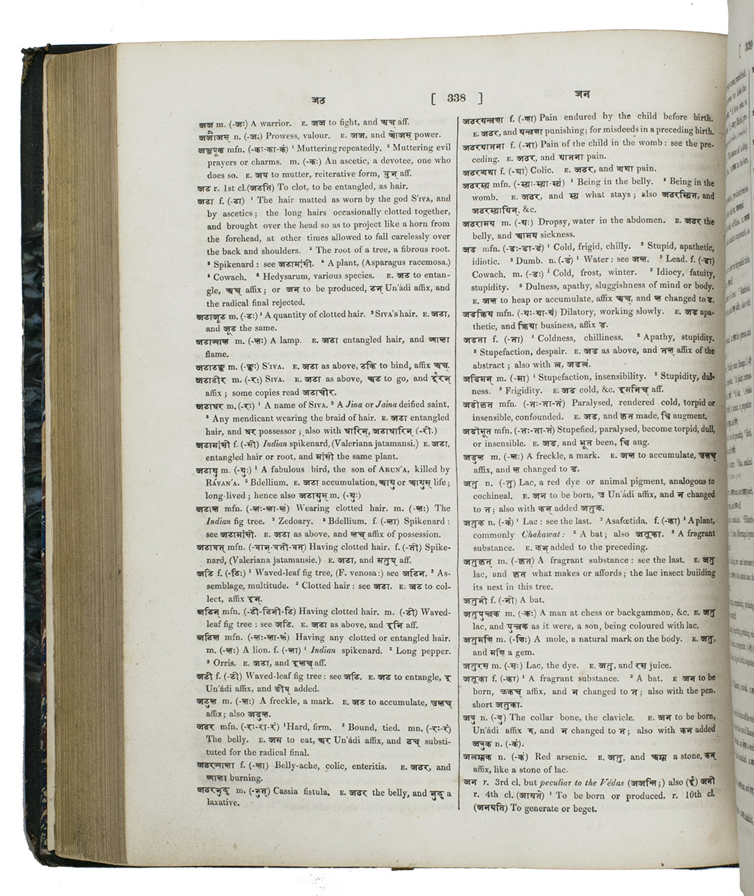 Second enlarged edition of the first etymological Sanskrit-English dictionary by the English orientalist Horace Hayman Wilson (1785-1860), originally published in 1819. The first edition was compiled from materials provided by native scholars, supplemented with Wilson's own research.