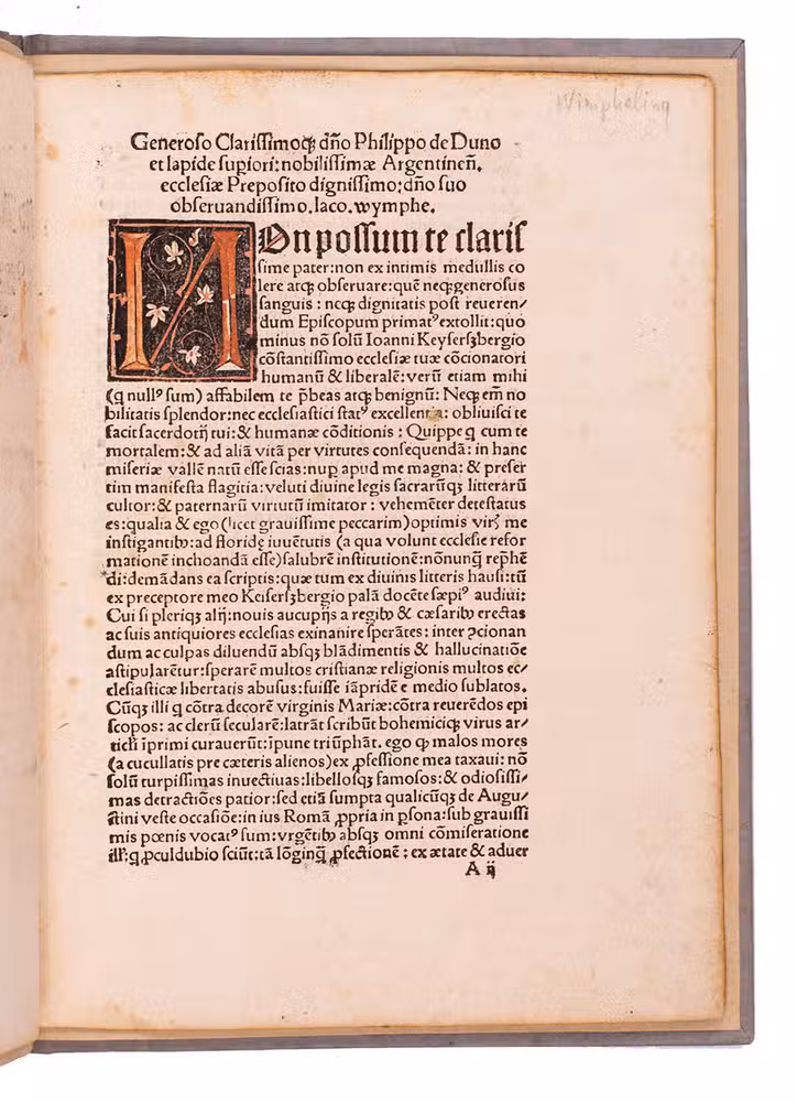 With the colouring of the initial offset onto the facing (blank) page, and with a manuscript note in a similarly coloured ink. In very good condition and with large margins. A window into strife in the Catholic Church a decade before the Reformation. J. Benzing & J. Müller, Bibliographie strasbourgeoise II, 18, no. 55; J. Knepper, Jakob Wimpfeling, pp. xiii, 187-195; Ritter, Livres du XVIe s. ... Strasbourg 2481 ; VD16, W3330.