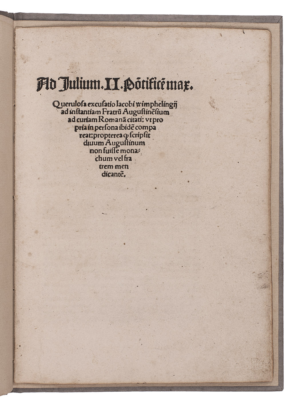 Ad Julium. II. Po[n]tifice[m] Max[imum]. Querulosa excusatio Jacobi Wimphelingii ad instantiam fratru[m] Augustine[n]sium ad curiam romana[m] citati: ut propria in persona ibide[m] compareat: proptereaq[ue] scripsit divum Augustinum non fuisse monachum vel fratrem mendicante[m].