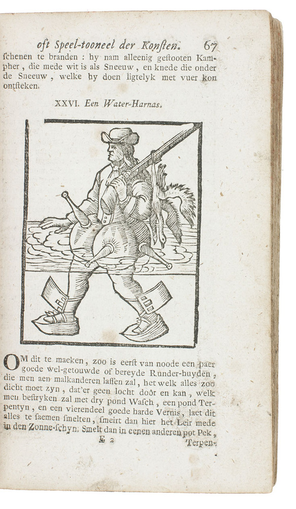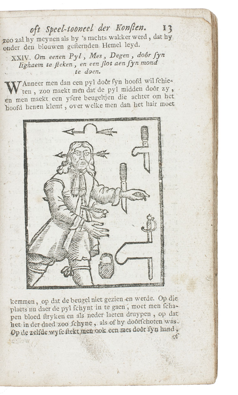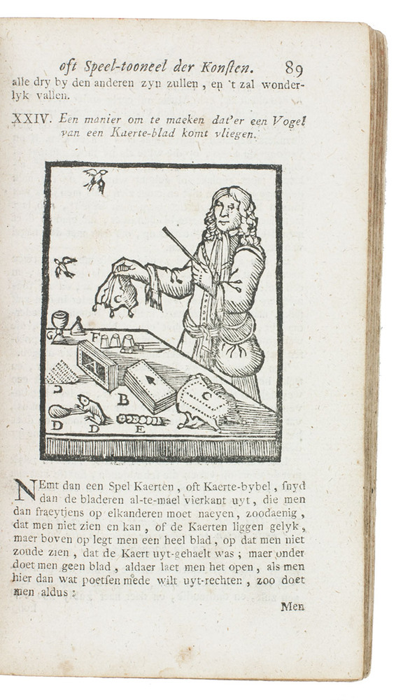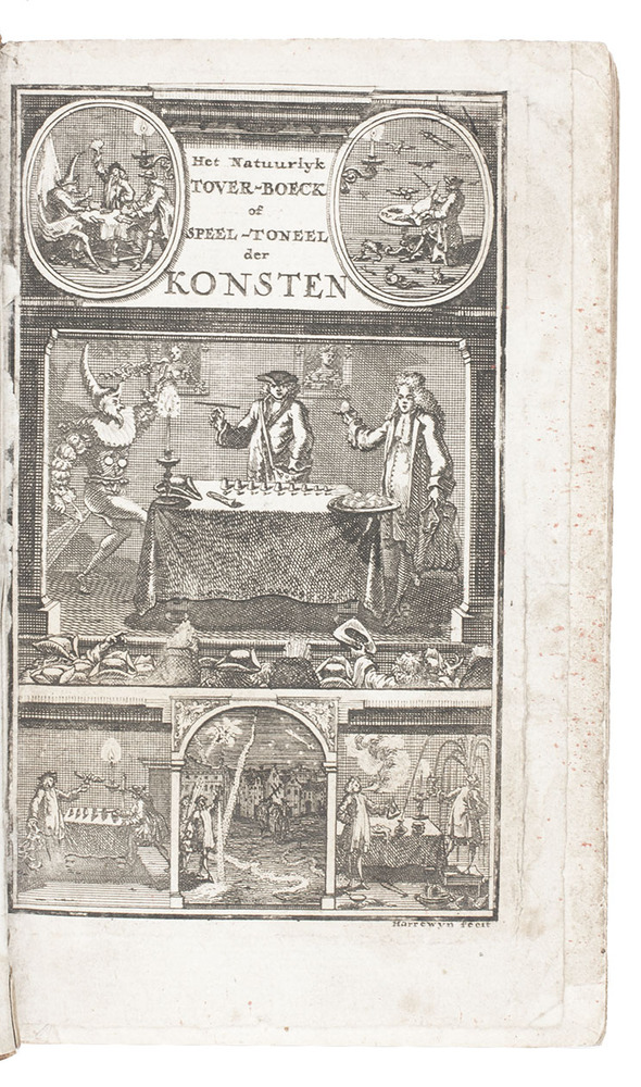 Easily the most popular Dutch conjuring and recreation book of the 18th century. On long winter evenings families and parties amused themselves with the help of the book, trying the various tricks and games. It contains about 2000 conjuring tricks, card games, exciting experiments with all sorts of materials, word and number games, riddles, etc. It also includes advice on drawing and colouring, on cosmetics, means of curing a pain, of making perfumed soaps, removing stains, etc. Reprinted for over a century the book continued amusing generations of children as well as adults in the home and at parties. Landwehr ascribes the book to Willem Goeree, who first published it at Middelburg in 1679. Goeree probably choose the pseudonym Witgeest (White spirit) as a guarantee that the book contained only white magic, not black magic. Its advice on drawing and colouring was taken from Goeree's Inleydinge tot de algemeene teyken-konst.