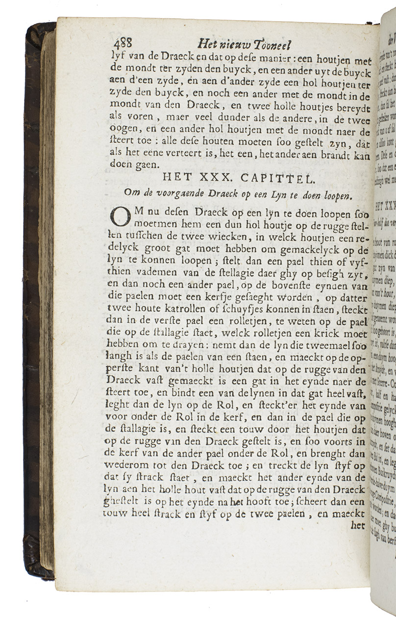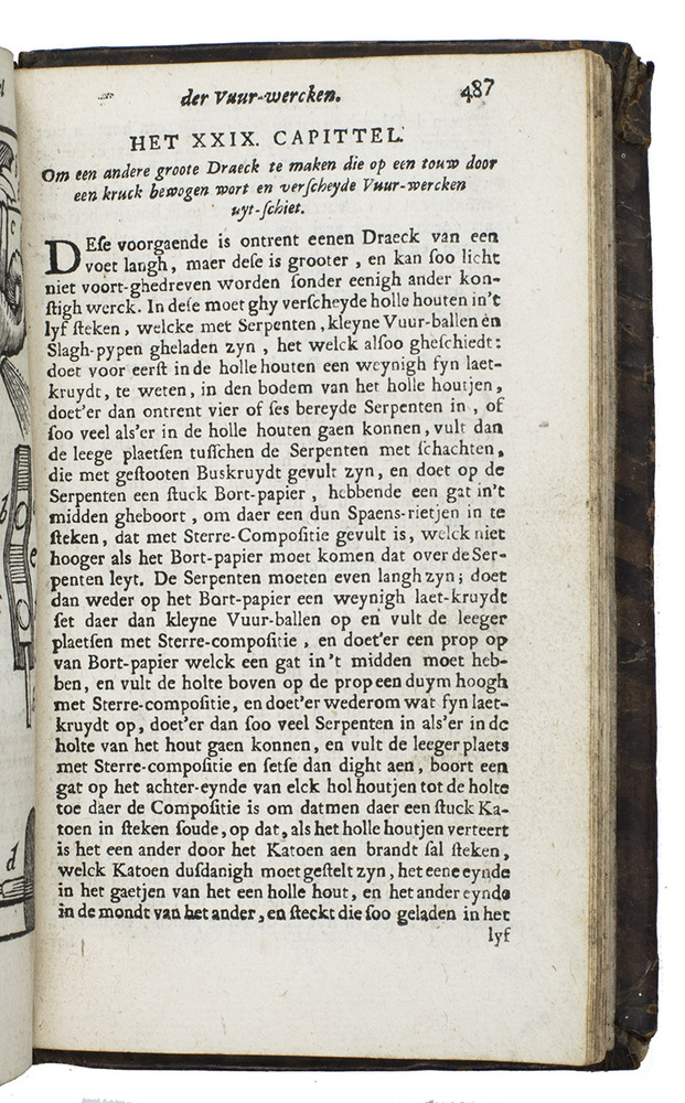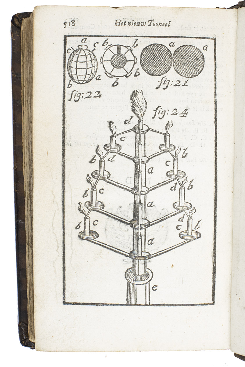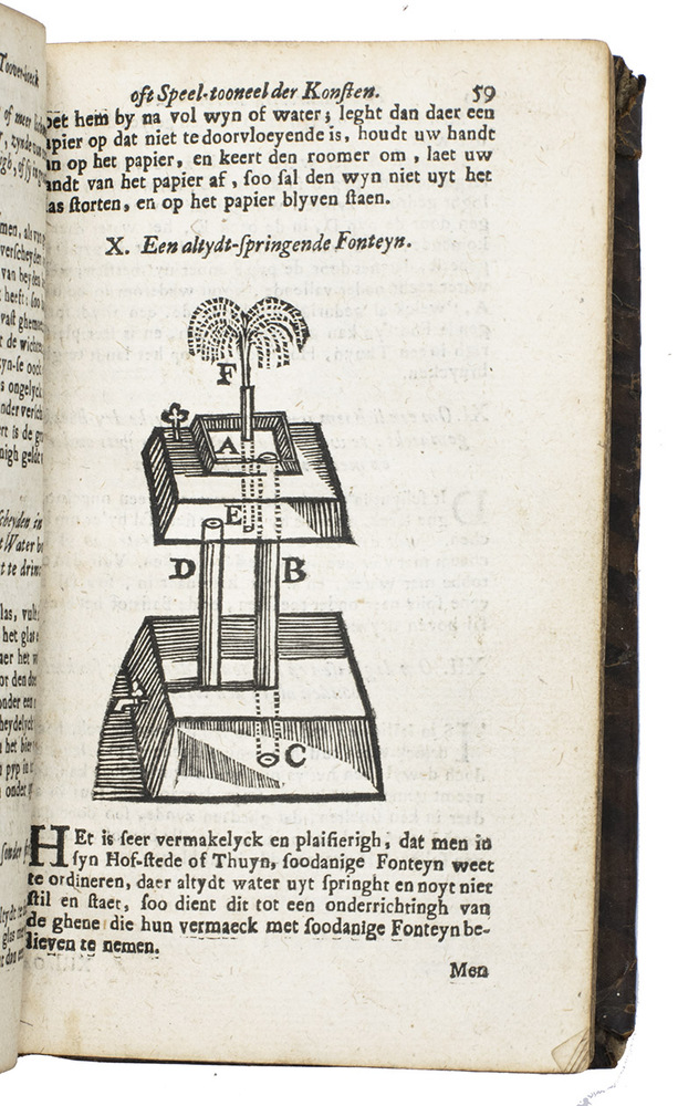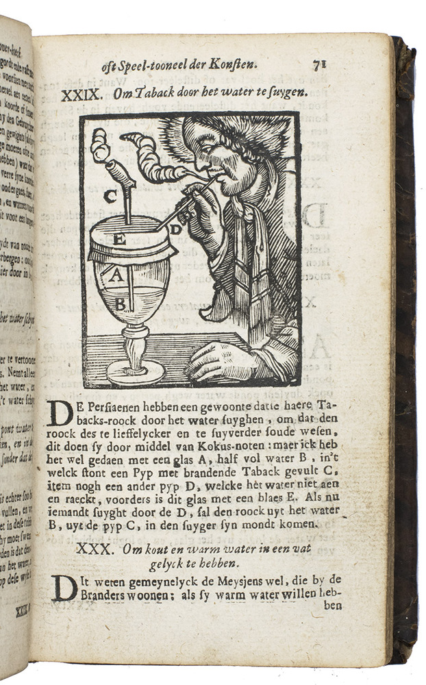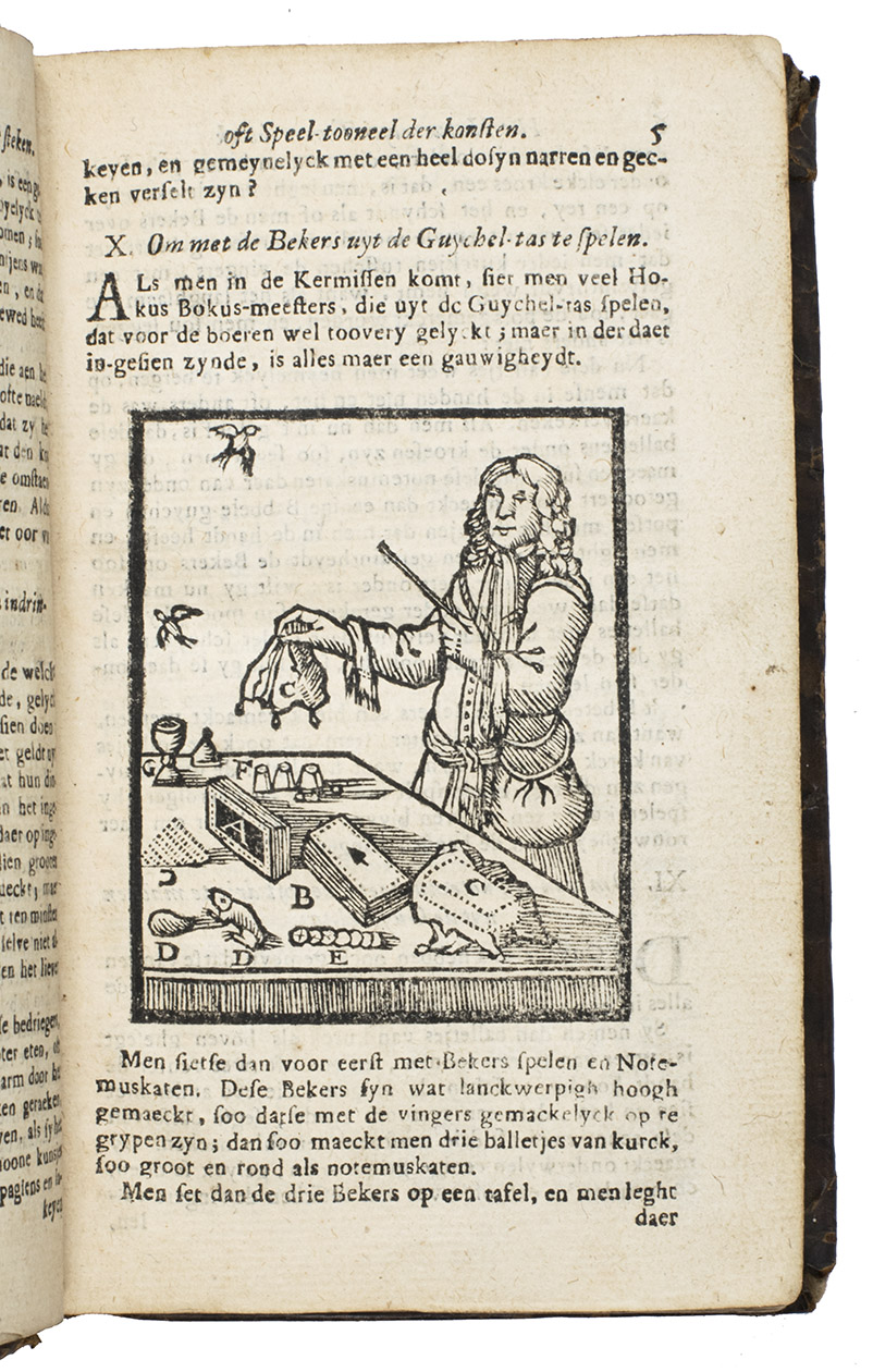 Easily the most popular Dutch conjuring and recreation book of the 18th century. On long winter evenings families and parties amused themselves with the help of the book, trying the various tricks and games. It contains about 2000 conjuring tricks, card games, exciting experiments with all sorts of materials, word and number games, riddles, etc. It also includes advice on drawing and colouring, on cosmetics, means of curing a pain, of making perfumed soaps, removing stains, etc. Reprinted for over a century the book continued amusing generations of children as well as adults in the home and at parties. Landwehr ascribes the book to Willem Goeree, who first published it at Middelburg in 1679. Goeree probably choose the pseudonym Witgeest (White spirit) as a guarantee that the book contained only white magic, not black magic. Its advice on drawing and colouring was taken from Goeree's Inleydinge tot de algemeene teyken-konst.