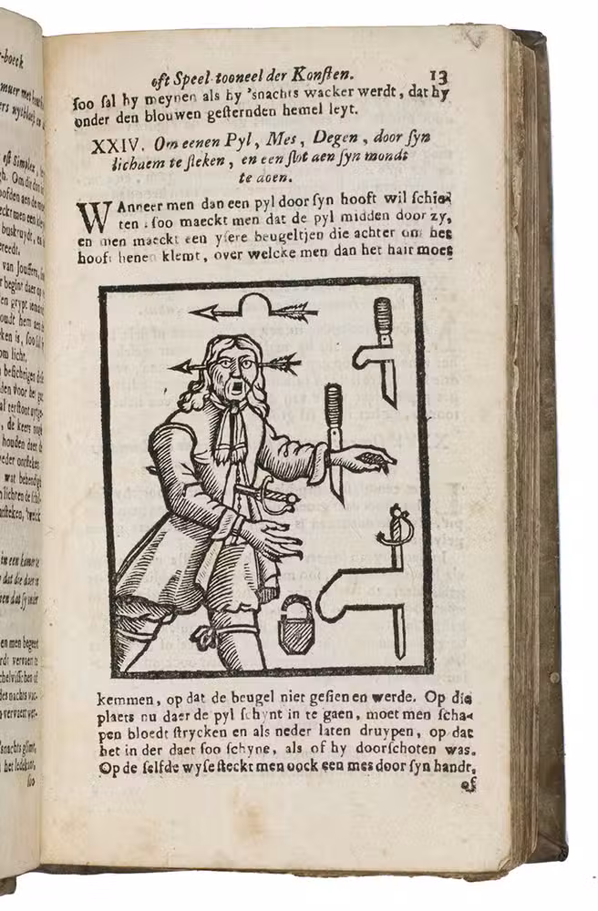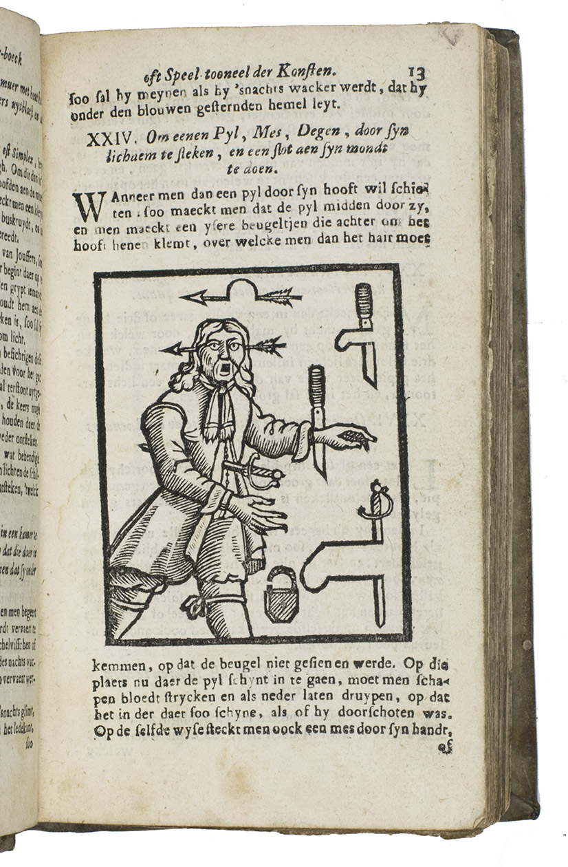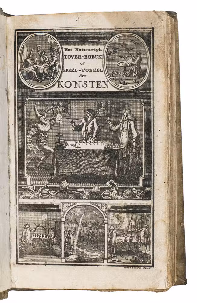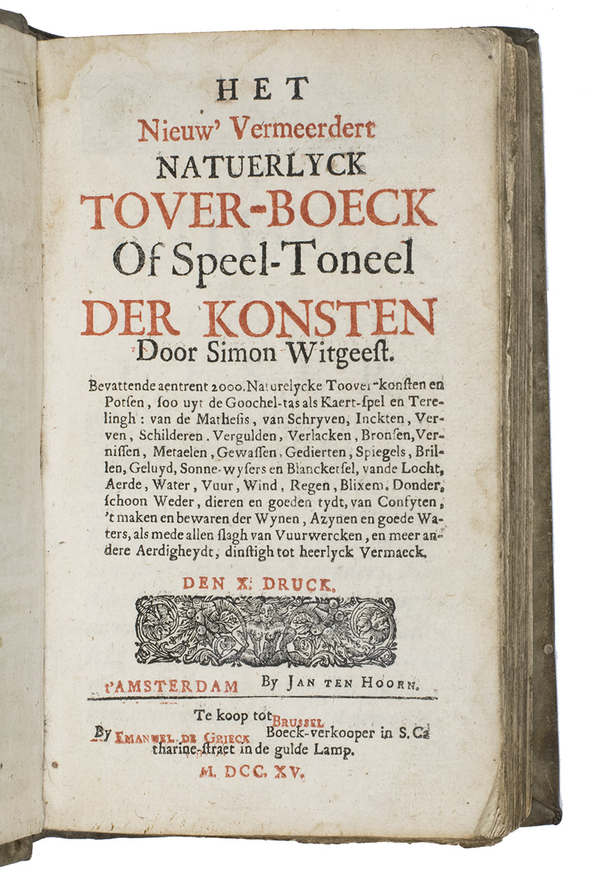 The 1715 edition (nominally the 10th but (possibly the 11th) of a very popular Dutch conjuring book that had been published for the first time by Jan ten Hoorn in Amsterdam in 1679 and frequently augmented in many, editions far into the 18th century. The present edition mentions 2000 tricks (tover-konsten), instead of the 500 in the 3rd edition. The book was also translated into German.