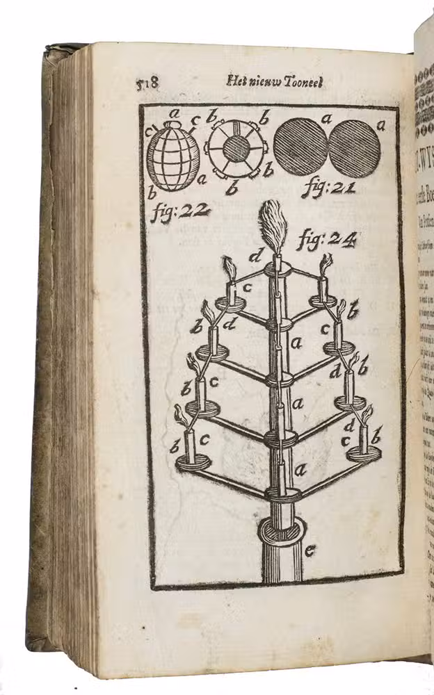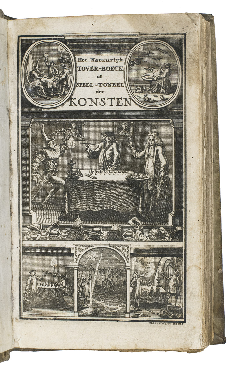 Amsterdam, Jan ten Hoorn (sold by Emanuel de Grieck, Brussels), 1715. 8vo. Title-page in red and black, with an engraved frontispiece containing 5 compartments showing tricks by Harrewijn after the frontispieces in the original editions by Jan van Hoorn in Amsterdam, 57 charming woodcuts illustrating the various tricks in the text (7 full-page in the last section on fireworks). Contemporary vellum, blind-tooled with a centrepiece on both sides. [10], 518, [40] pp.
