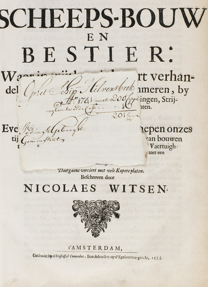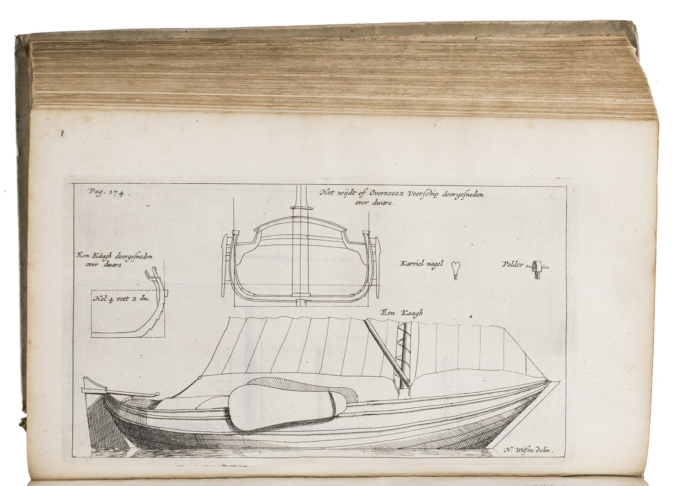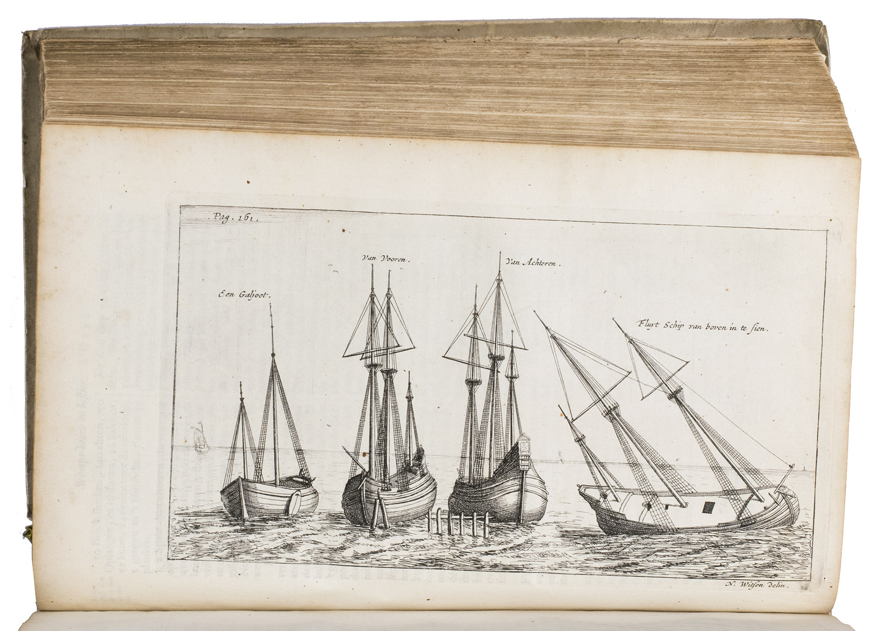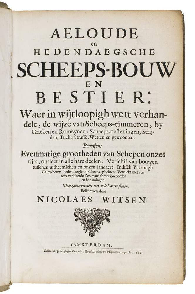 Extremely rare issue of the first edition of Witsen's incredibly influential work on 17th-century Dutch shipbuilding techniques and styles. The other issue appeared in the same year with the impressum of C. Commelijn and J. Appelaer, instead of C. Cunradus. Both contain the same engraved title page by Romeyn de Hooghe, but the principle difference can be found in the letterpress title page, with ours being printed in black and showing a different vignette.