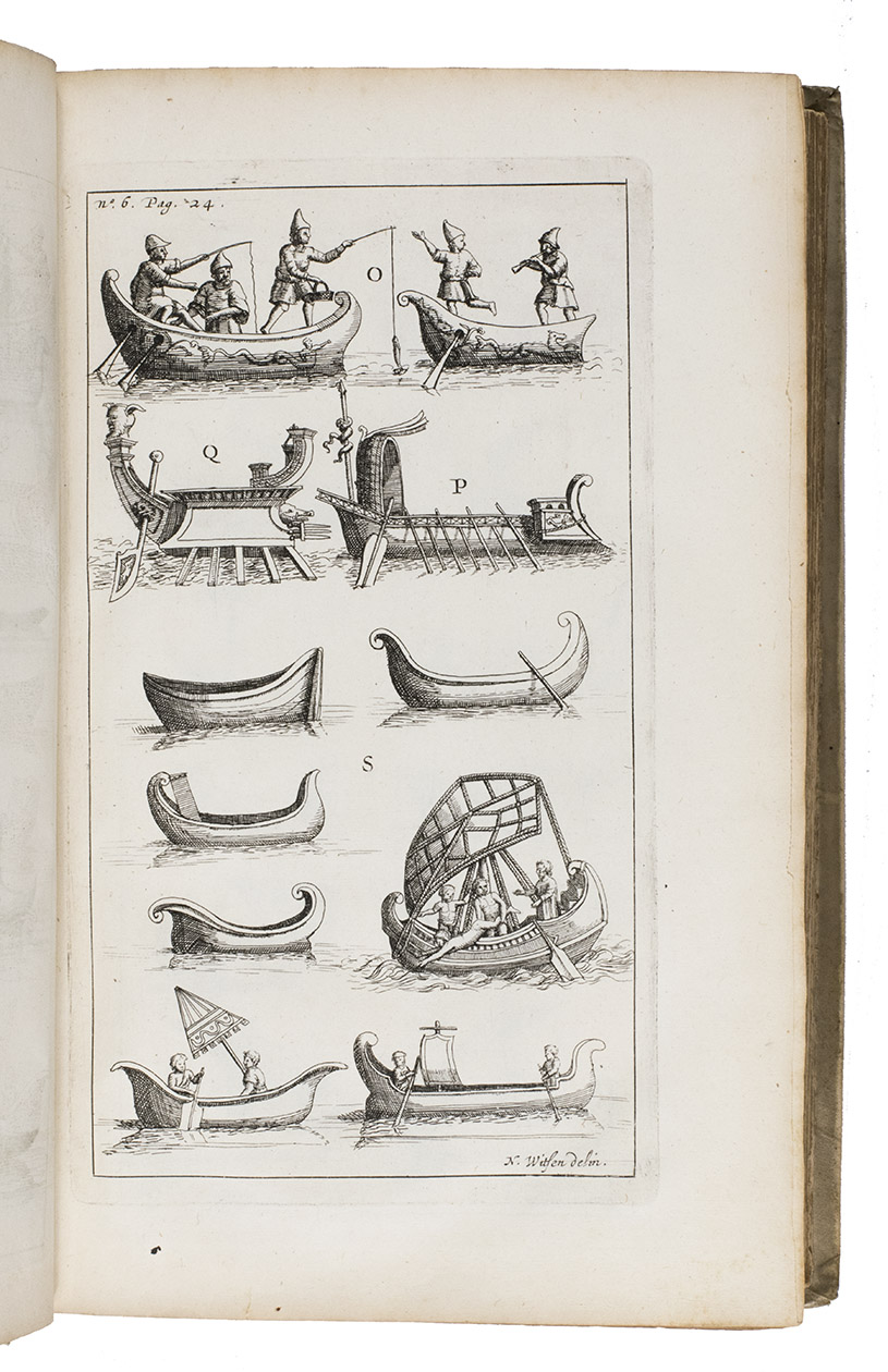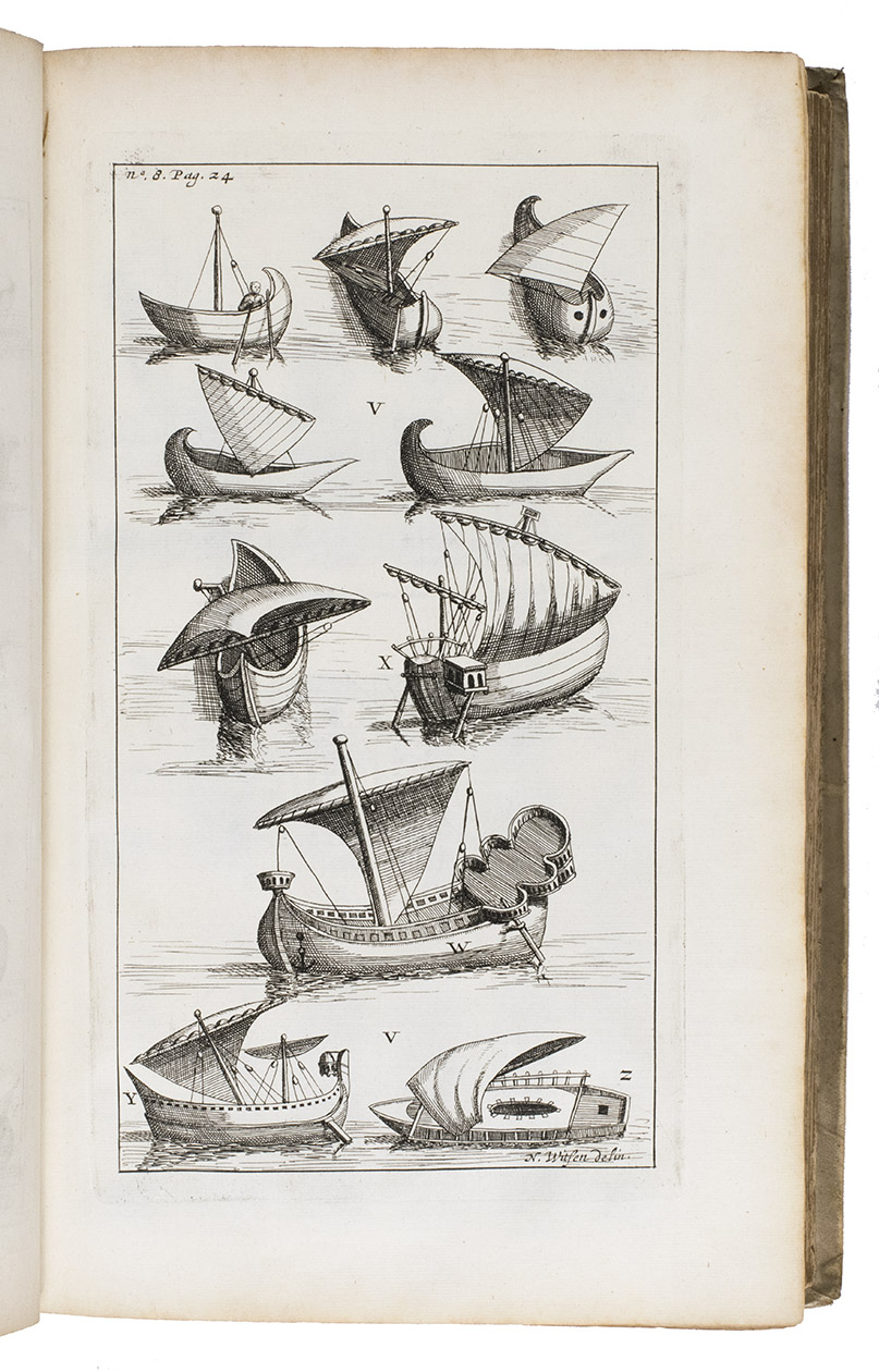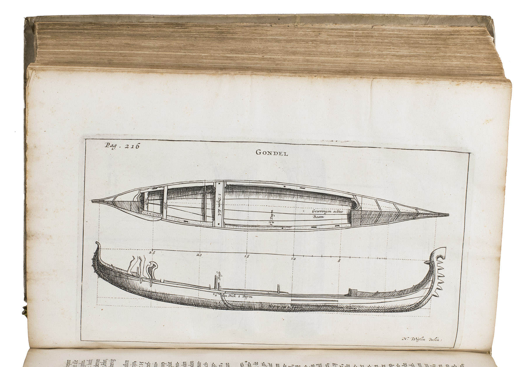 Extremely rare issue of the first edition of Witsen's incredibly influential work on 17th-century Dutch shipbuilding techniques and styles. The other issue appeared in the same year with the impressum of C. Commelijn and J. Appelaer, instead of C. Cunradus. Both contain the same engraved title page by Romeyn de Hooghe, but the principle difference can be found in the letterpress title page, with ours being printed in black and showing a different vignette.