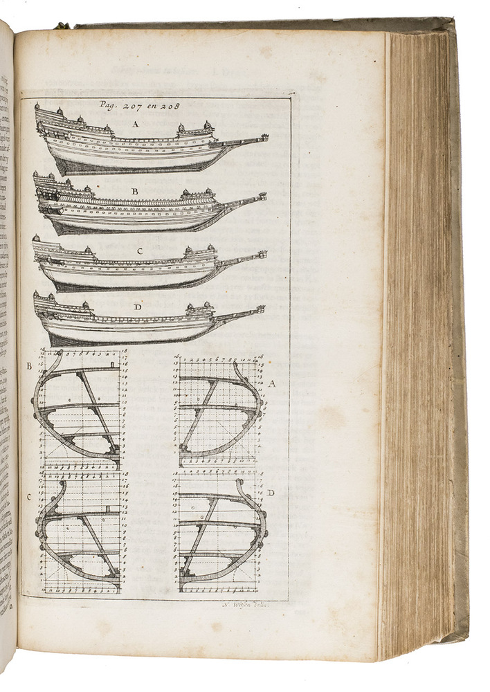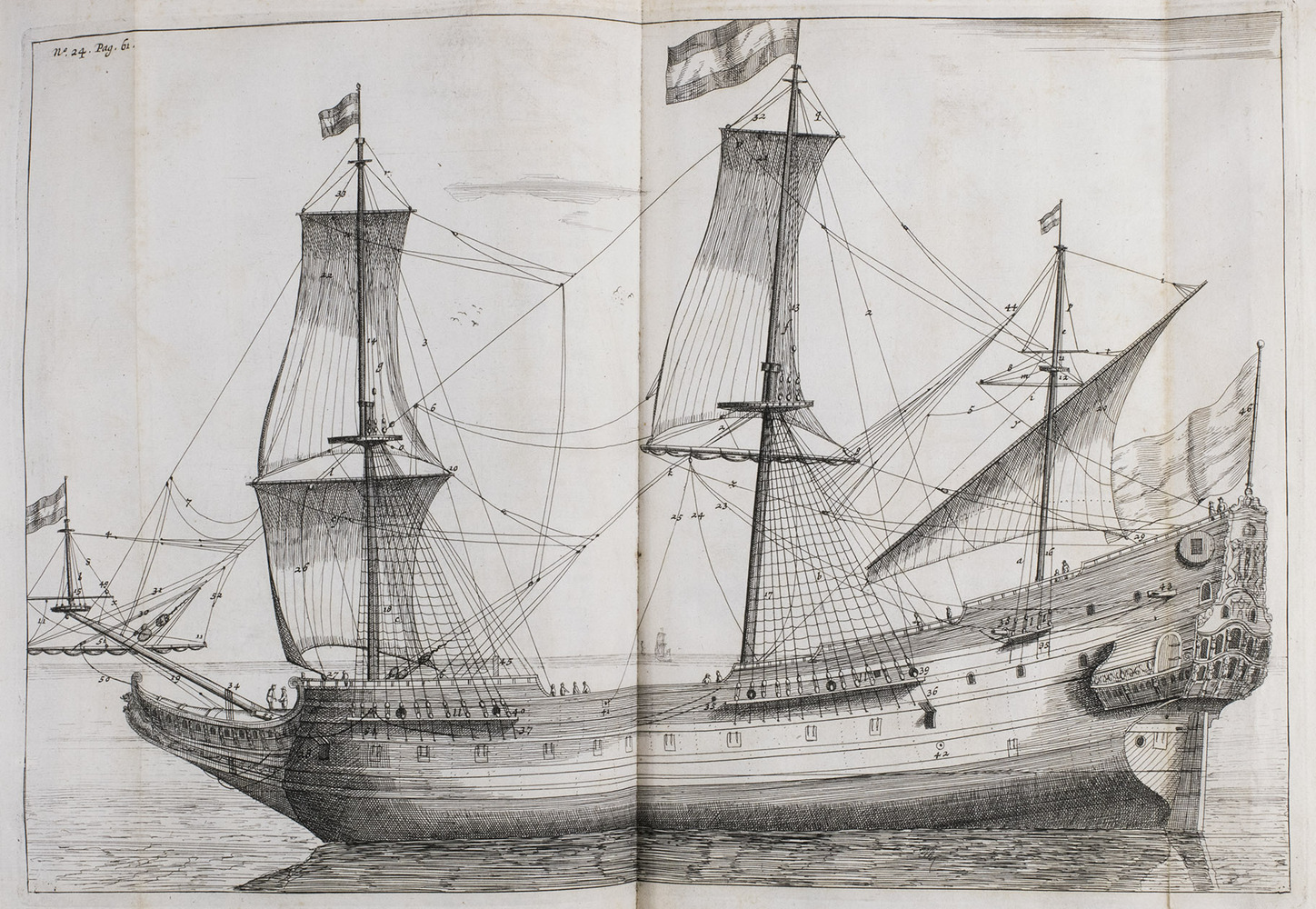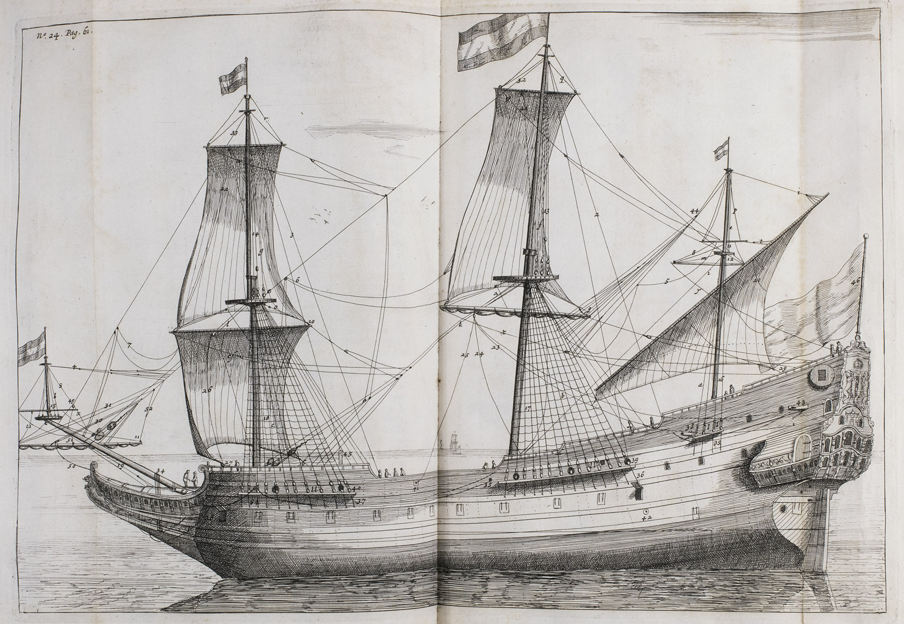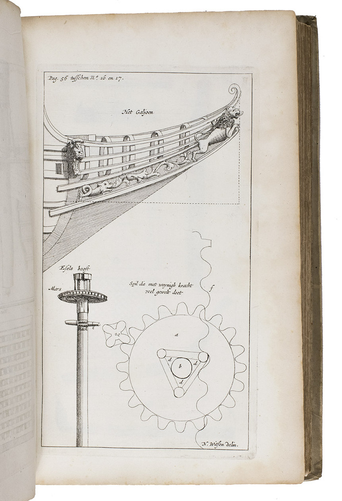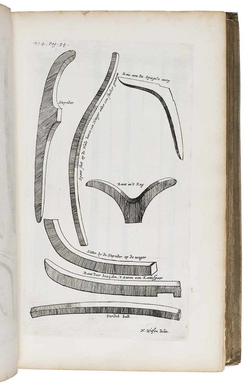 Notably, Witsen's work contains more than 110 meticulously detailed engraved plates based on drawings by the author himself. Considered the definitive work on shipbuilding, Aeloude en hedendaegsche Scheepsbouw was the product of Witsen's passion as a wealthy enthusiast and future regent. Only someone connected to regent circles would have had access to the exclusive information contained within its pages. The book, a precious item that required a deposit of twelve guilders, would primarily have graced the libraries of affluent members of Dutch society.