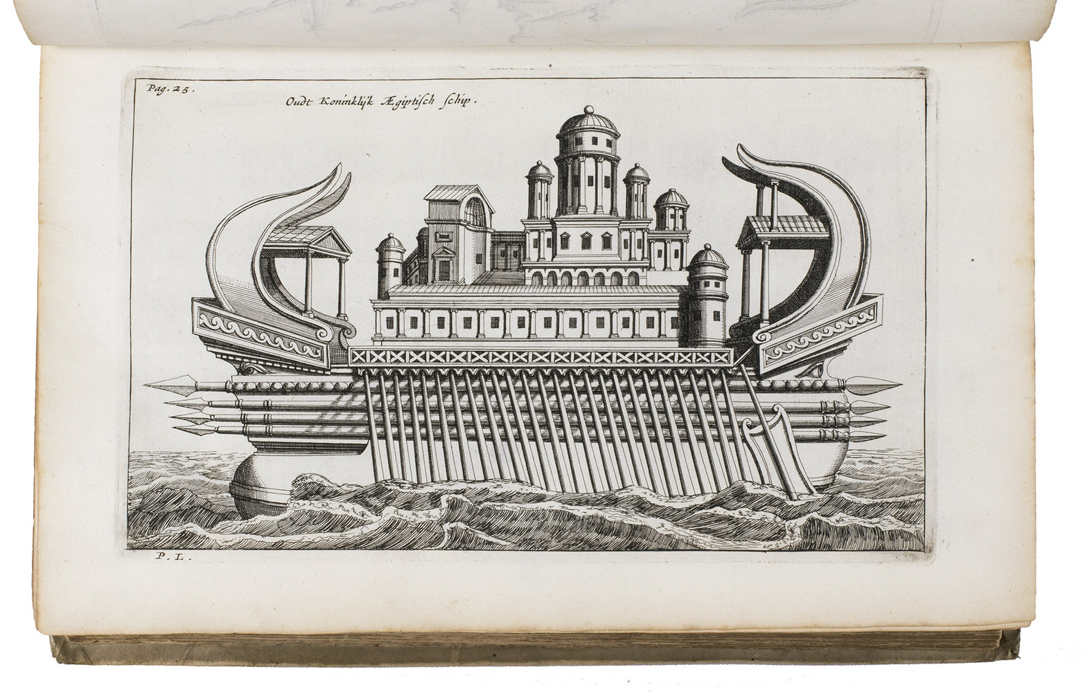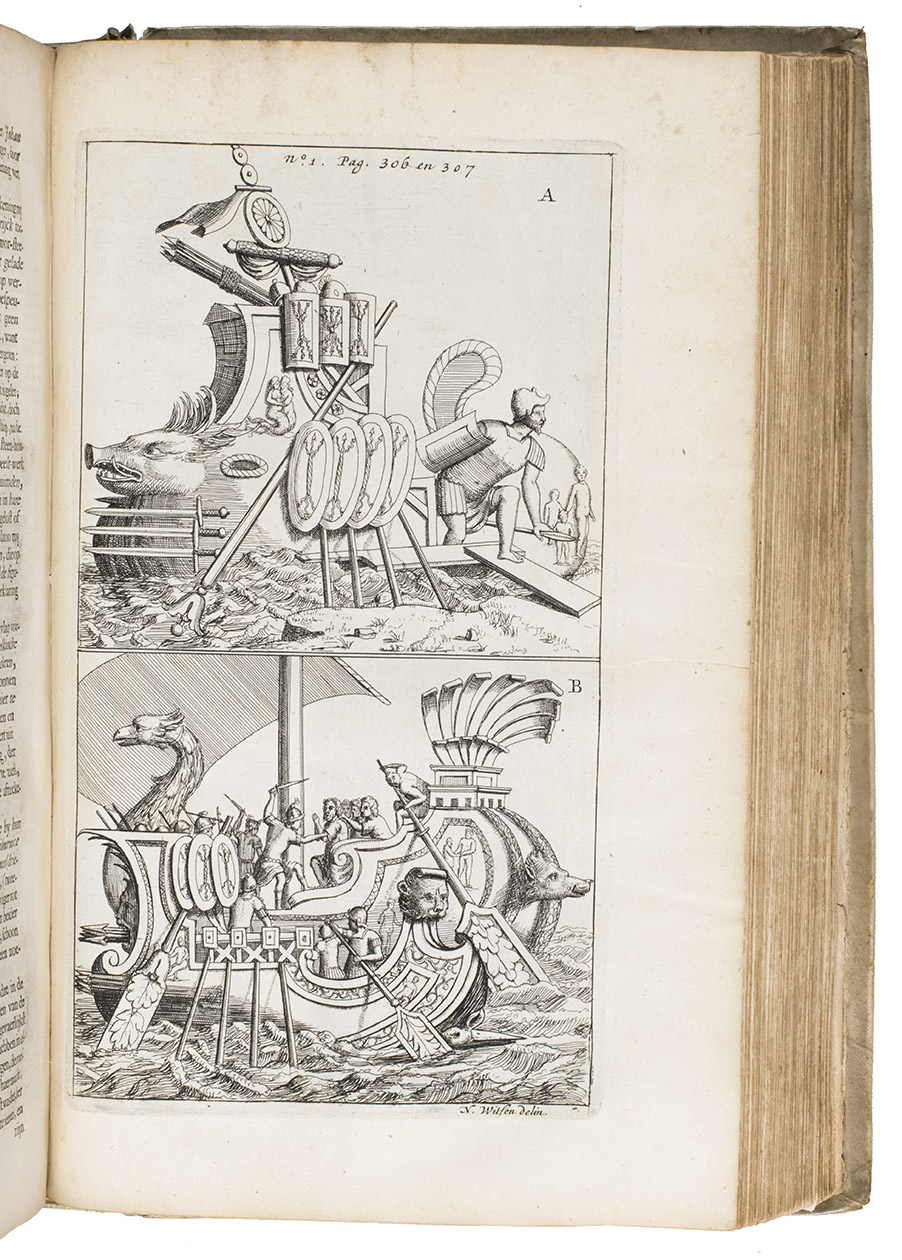 Amsterdam, Christoffel Cunradus, 1671. 2 parts in 1 volume. Folio. With an engraved title page by Romeyn de Hooghe, 112 full-page engraved plates, 1 folding double-page engraved plate and 7 small engraved plates printed on smaller strips of paper. With a small woodcut ornamental vignette on the title page, woodcut decorated initials and woodcut ornamental tailpieces. Near contemporary (18th-century?) elaborately blind-tooled vellum, sewn on five supports with corresponding raised bands on the spine, with a manuscript title in the second (of six) compartment on the spine, later brown leather ties. [16], 516, 40, [4] pp.