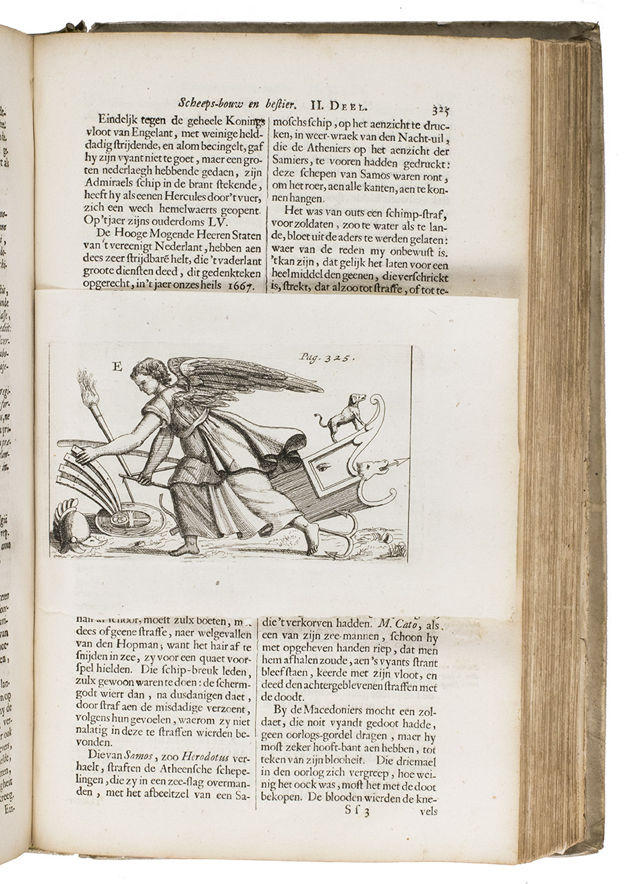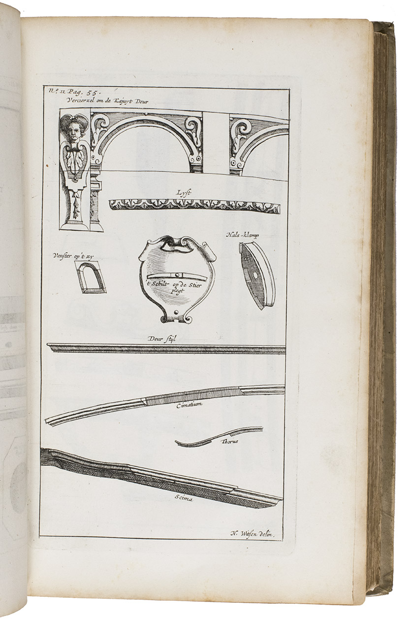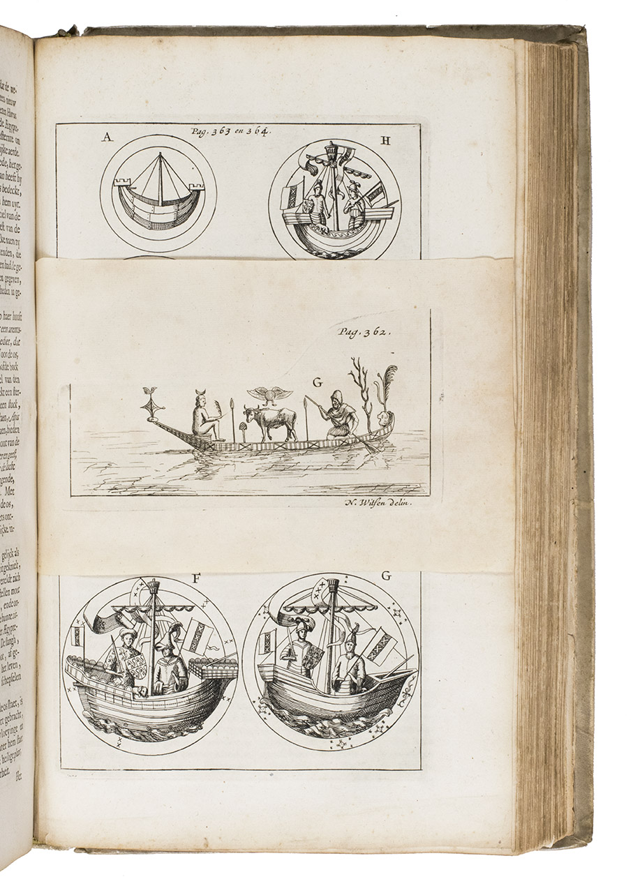 With a small 18th-century manuscript note tipped in before the letterpress title page: "Op het schip Hilversbeek (?) de Ao 1741 ...", a small black stamp on the front pastedown "10 [...?] 1969" and the printed coat of arms of Ortt pasted on the front pastedown next to the stamp. The binding is slightly scuffed, the front hinge has been reinforced and new brown leather ties have been added. The engraved title page is slightly damaged in the gutter, not affecting the engraving and with some small tears in some pages, not affecting the text or plates, the edges and outer margins are very slightly browned. Otherwise in very good condition. Bierens de Haan 5368; Hoogendoorn, Witsen N04; Landwehr Romeyn de Hooghe, 16; NHSM p. 743; NNBW IV, 1473; STCN 240219058 (2 copies).