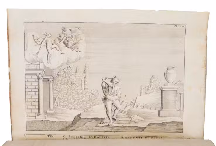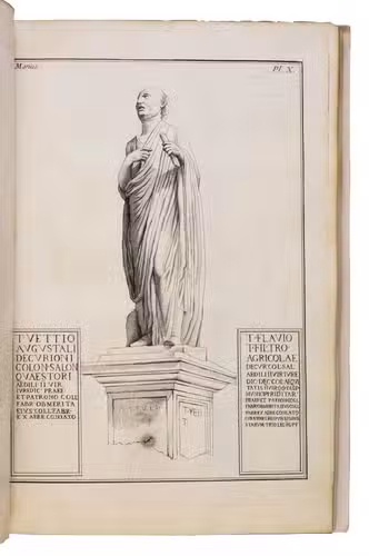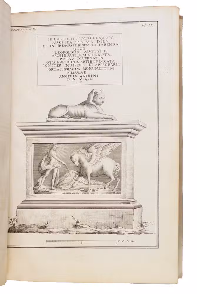 The villas gardens were conceived on an ambitious scale, incorporating parterres, garden temples, a coffee house, and a Chinese pavilion, together with Querinis extensive collection of sculptures, later dispersed. This now-lost cultural landscape is preserved through the plates, which include a folding plan and 29 numbered illustrations (two of them folding), as well as an engraved title page with a vignette by Giovanni de Pian (1764-1800).