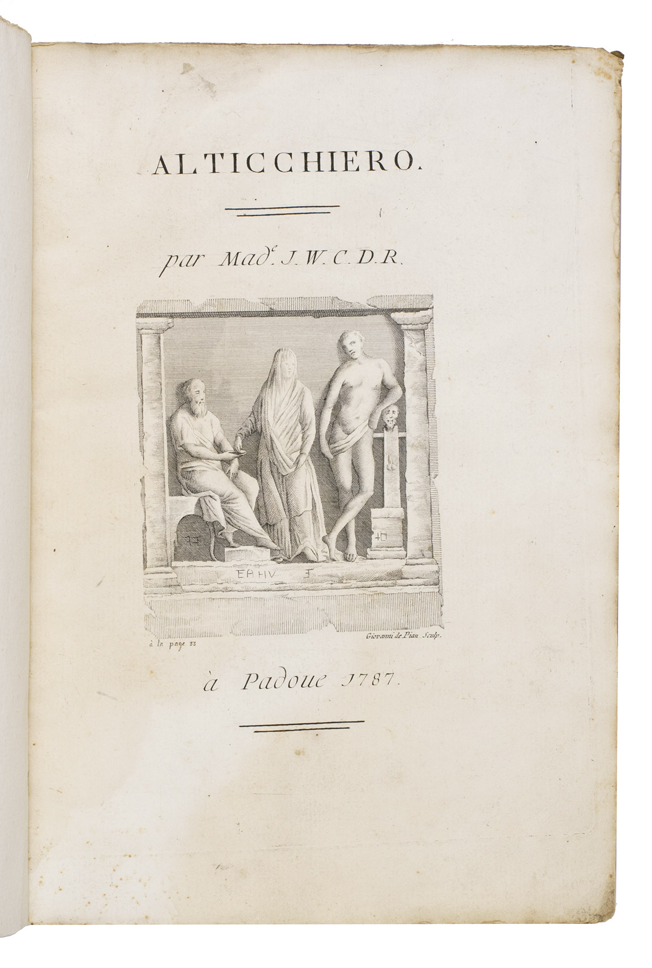 First edition of a vivid description, in French, of the country villa, gardens, and outdoor sculpture collection of the Venetian intellectual Angelo Querini (1721-1796) at Alticchiero, near Padua. Dedicated to William Petty (1623-1687), Marquess of Lansdowne, Prime Minister in 1782-83, the work provides a remarkable record of what was considered one of the most significant Italian gardens of the Enlightenment.
