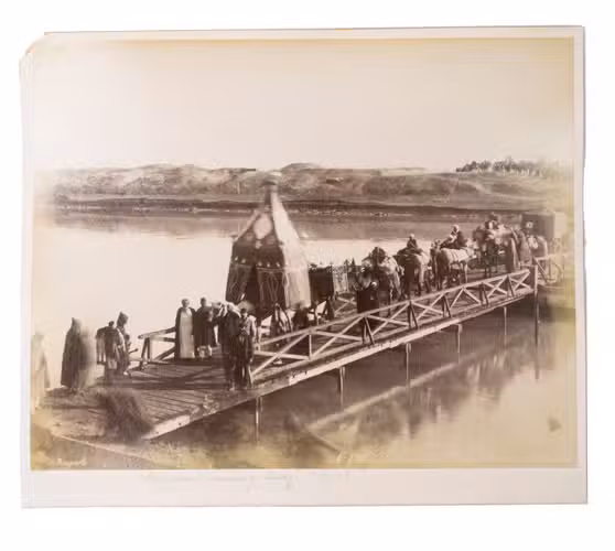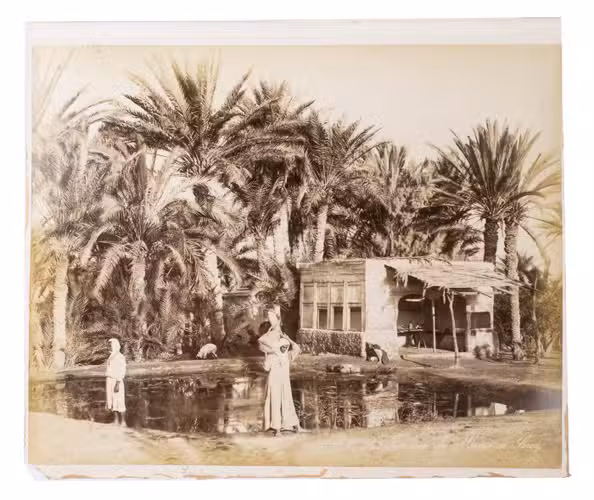 Collection of three photographs of North Africa by the famous Zangaki brothers, some of the earliest and most well-known photographers working in Egypt in the 19th century. The first two photographs show the Fountain of Moses near Suez, and the procession of the holy carpet crossing the Suez canal. The third photograph, which is unsigned, shows a group of pilgrims, possibly located outside the city hall of Sfax, Tunisia.
