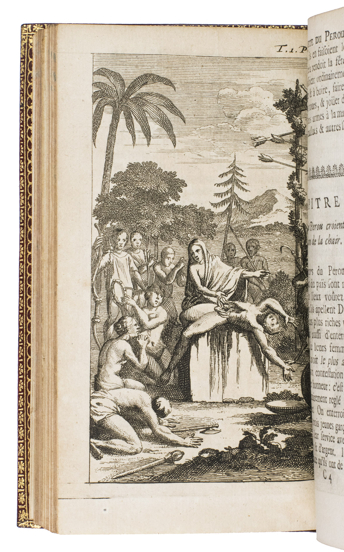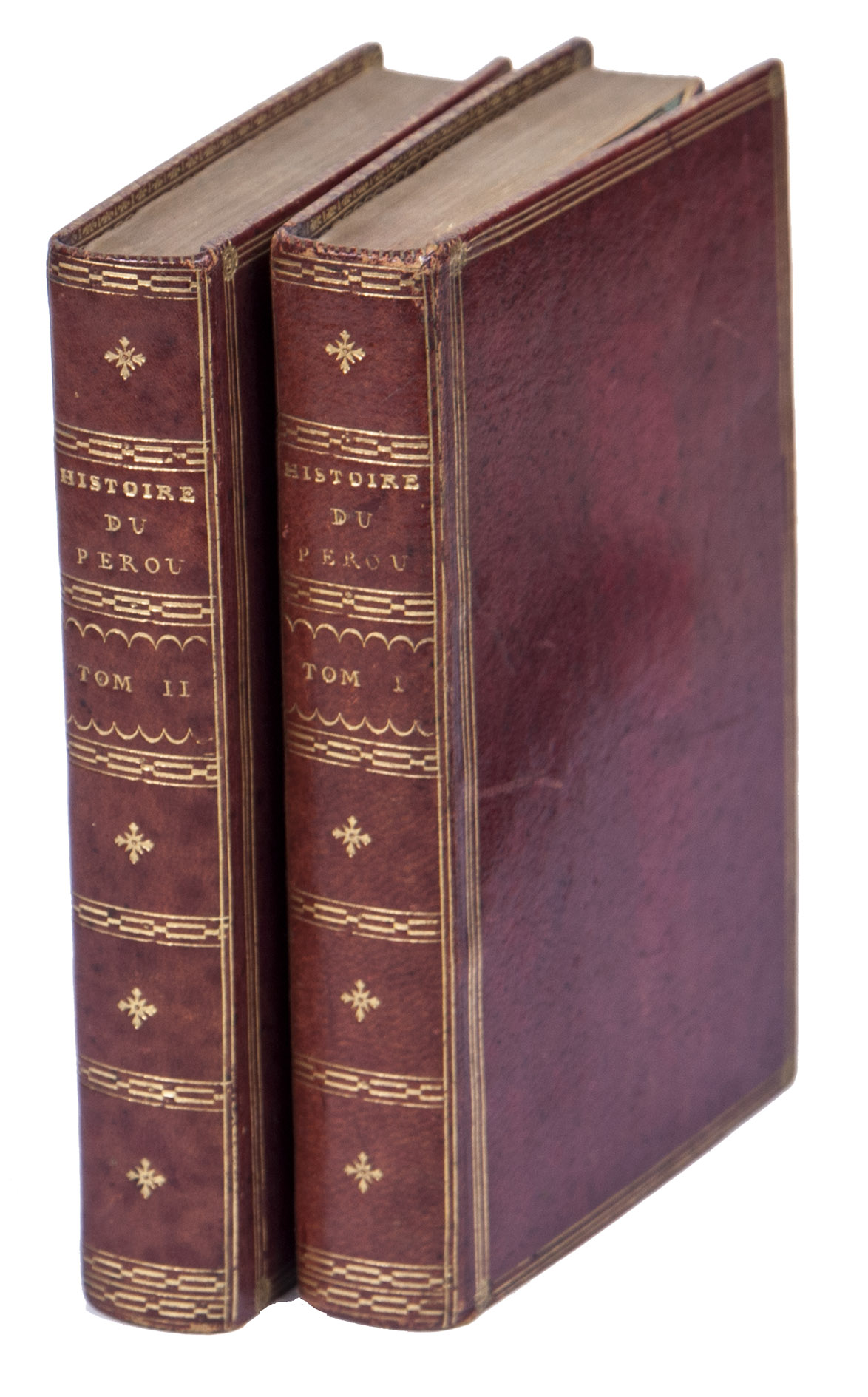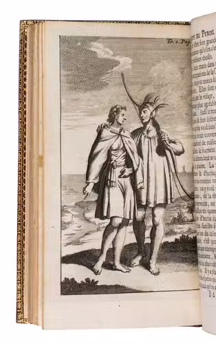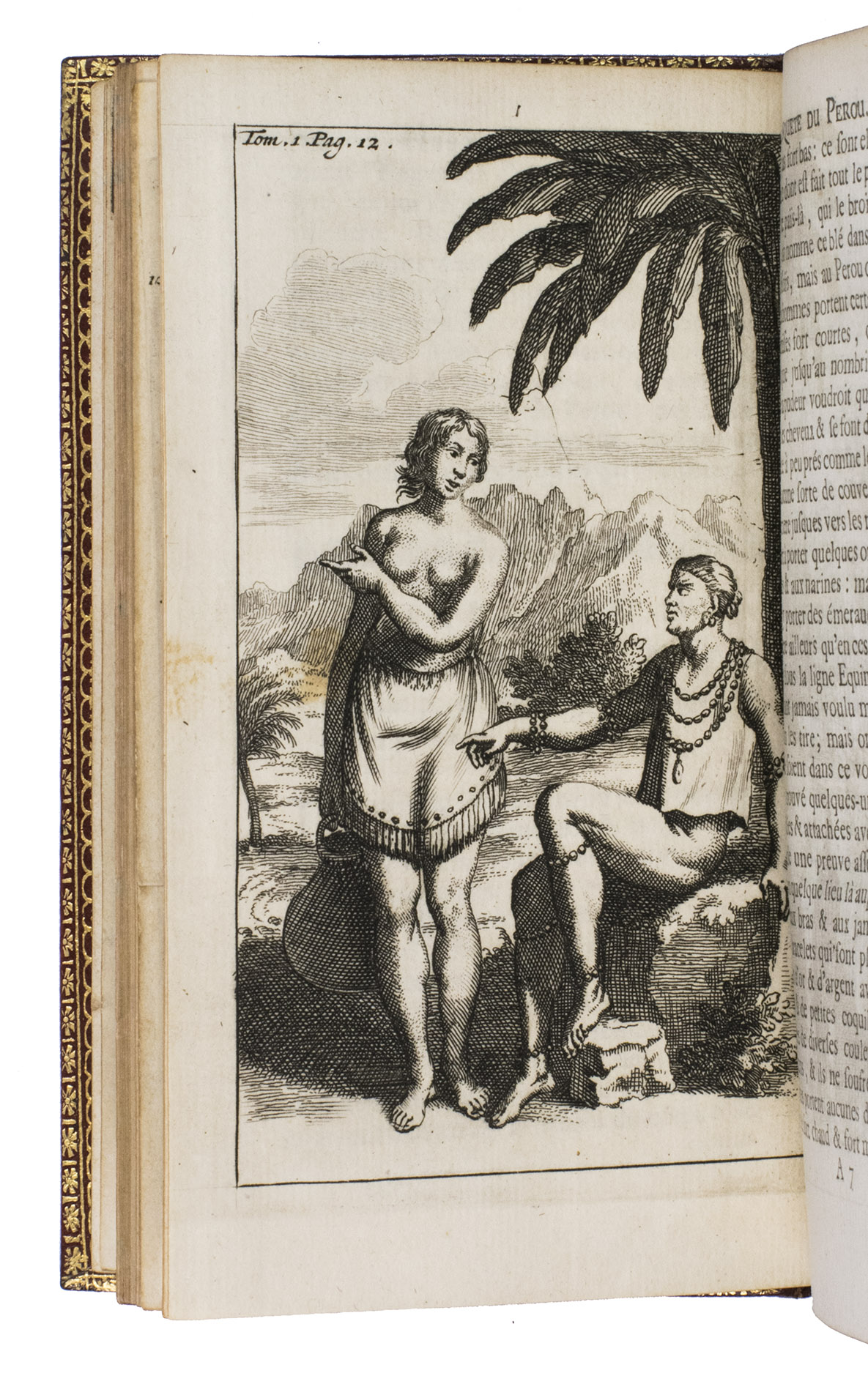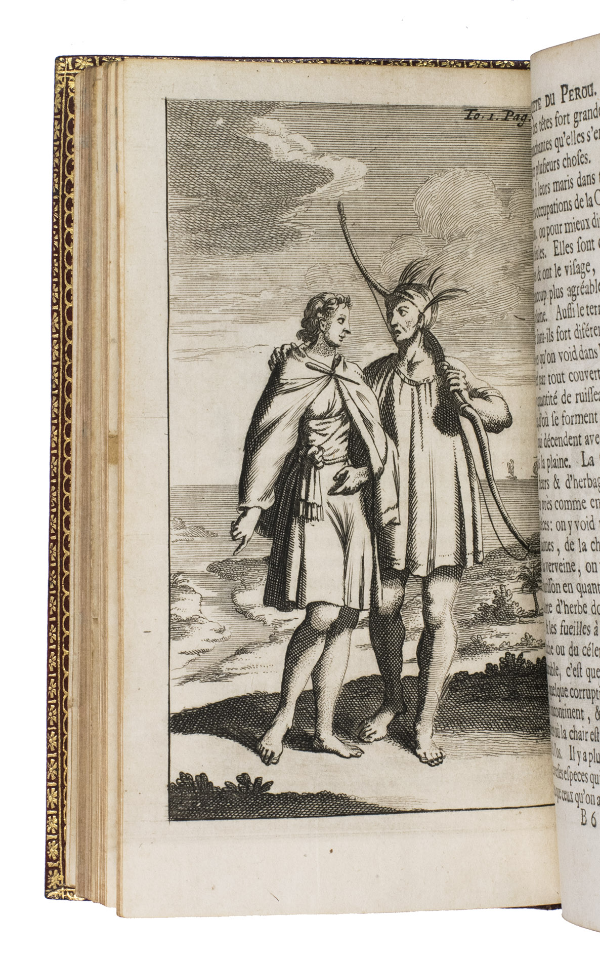 Amsterdam, J. Louis de Lorme, 1700. 2 volumes. 12vo. With an engraved frontispiece, a folding engraved map of Peru, 11 engraved plates, and 2 folding engraved plates. Further with two different woodcut vignettes on the red and black title-pages of both volumes, woodcut decorated initials, woodcut headpieces and headpieces built up from typographical ornaments, and a large ornamental woodcut tailpieces. 18th-century gold-tooled red morocco. [1], [1 blank], [36], 307, (1 blank); [1], [1 blank], [4], 408 pp.