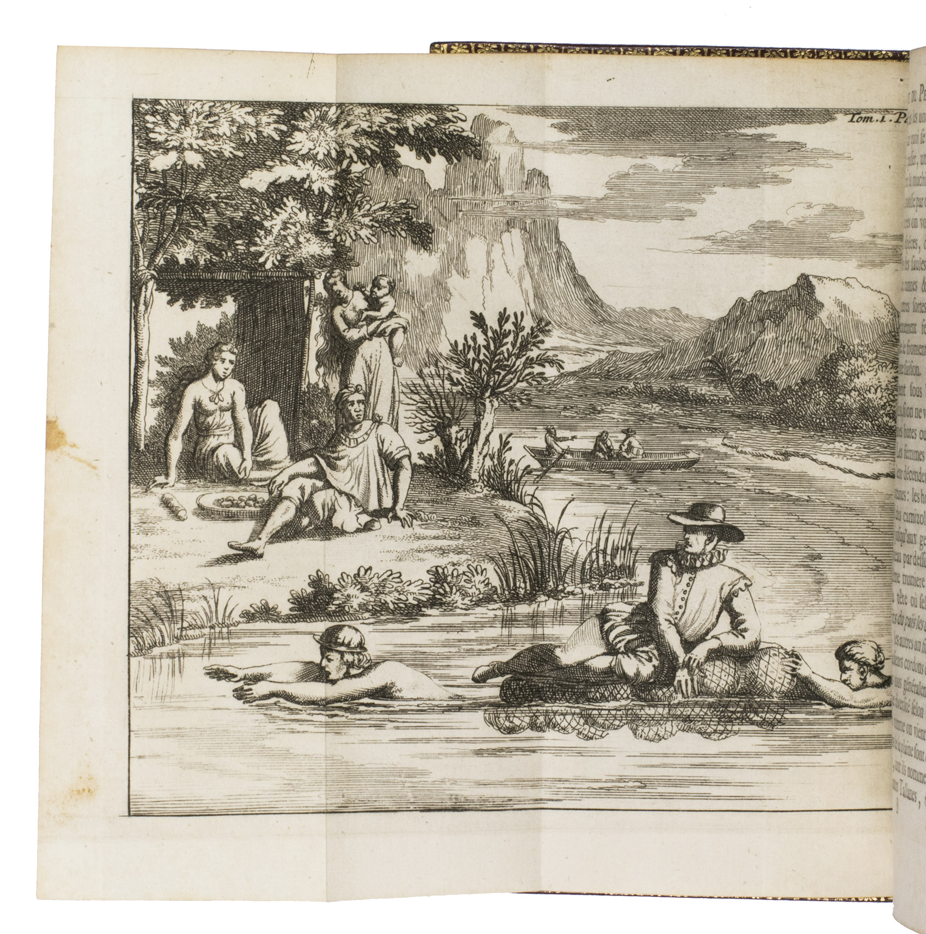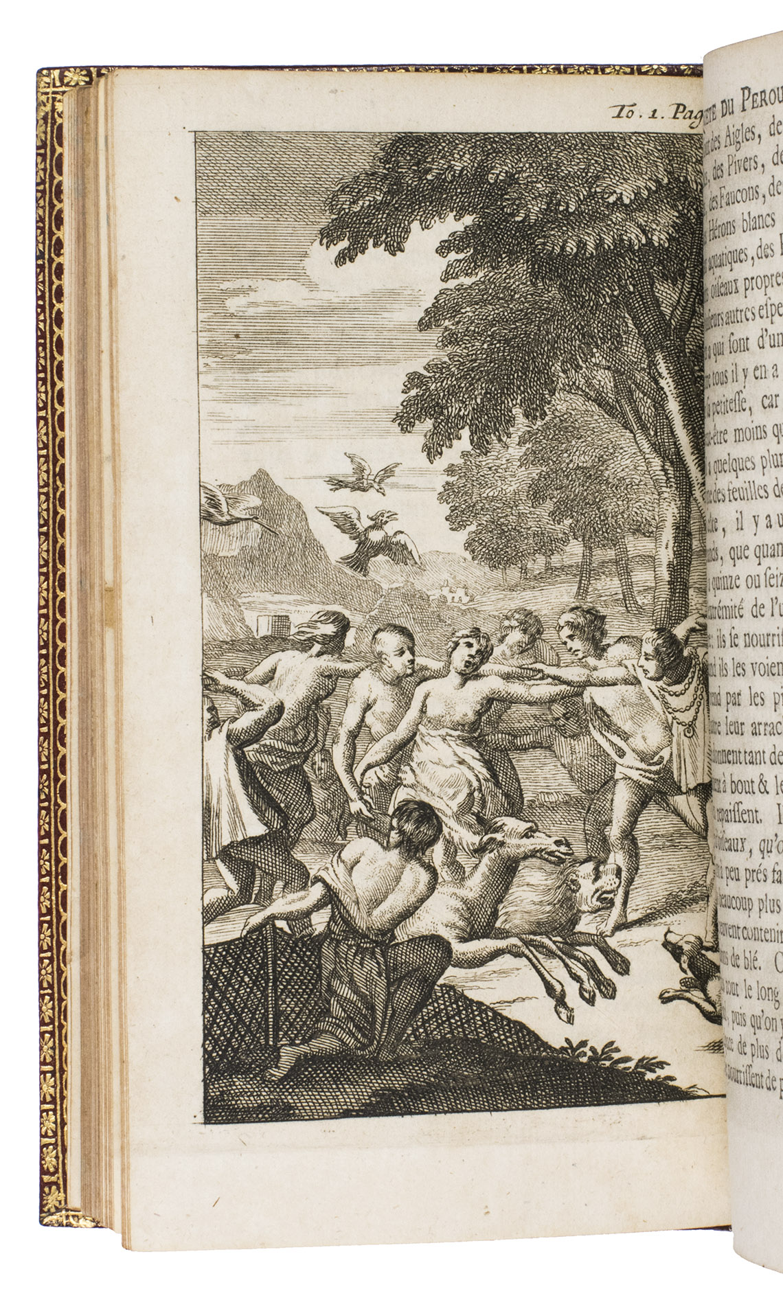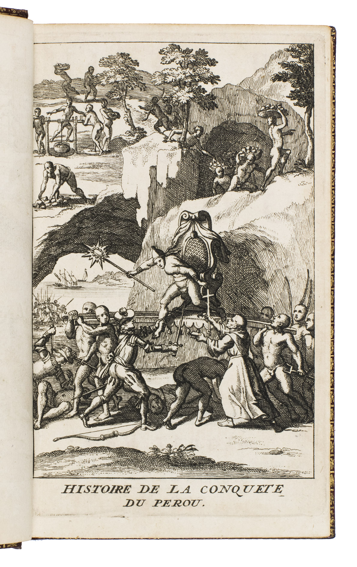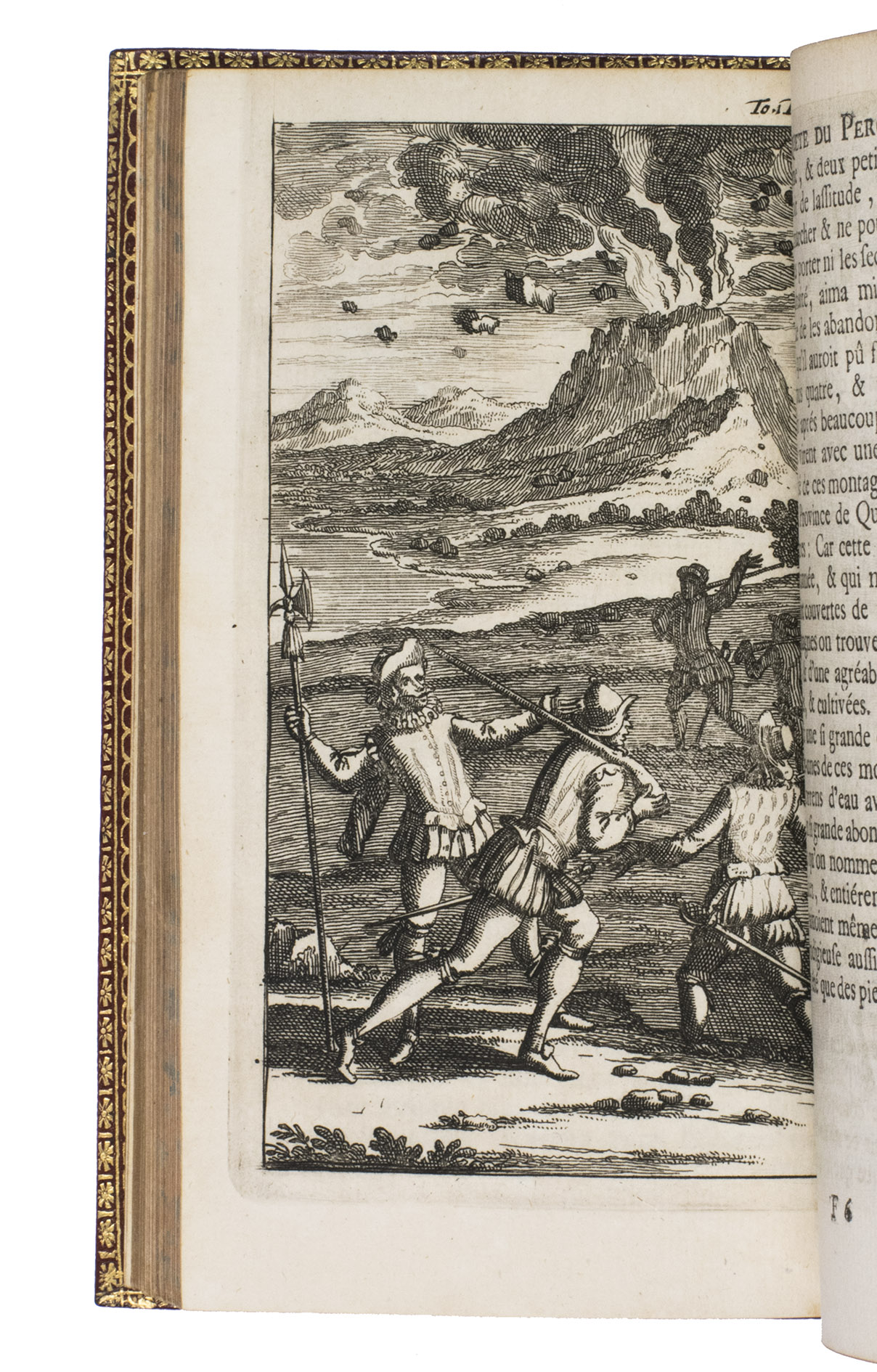 Amsterdam, J. Louis de Lorme, 1700. 2 volumes. 12vo. With an engraved frontispiece, a folding engraved map of Peru, 11 engraved plates, and 2 folding engraved plates. Further with two different woodcut vignettes on the red and black title-pages of both volumes, woodcut decorated initials, woodcut headpieces and headpieces built up from typographical ornaments, and a large ornamental woodcut tailpieces. 18th-century gold-tooled red morocco. [1], [1 blank], [36], 307, (1 blank); [1], [1 blank], [4], 408 pp.
