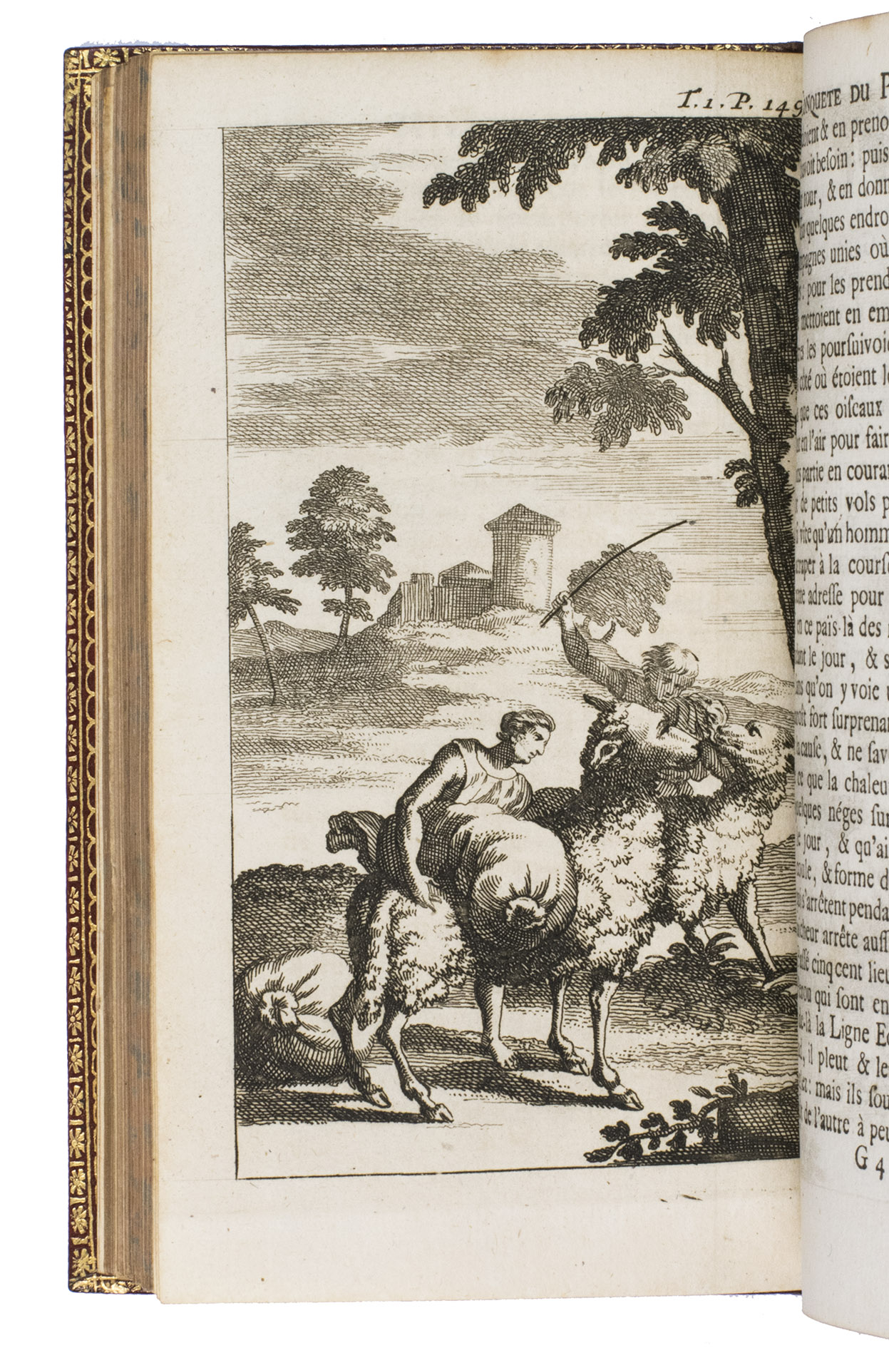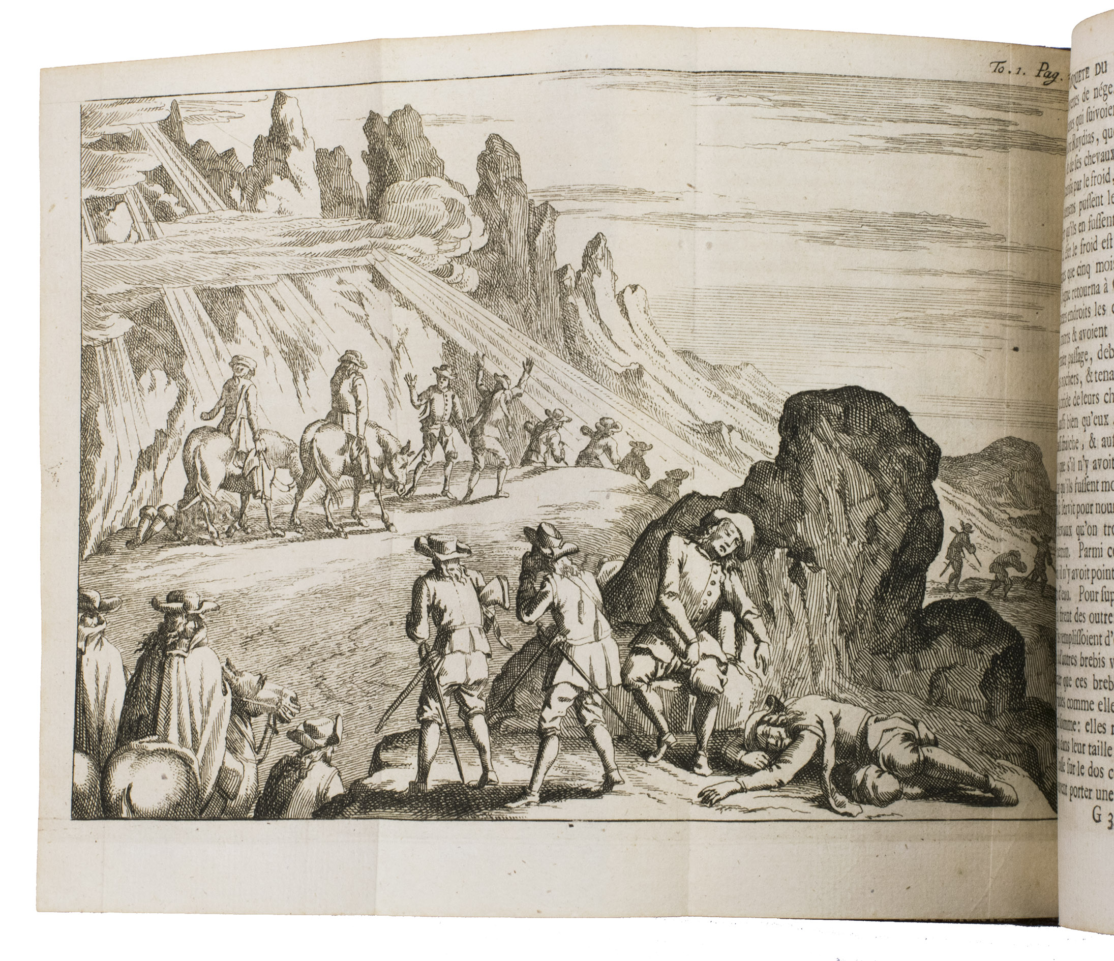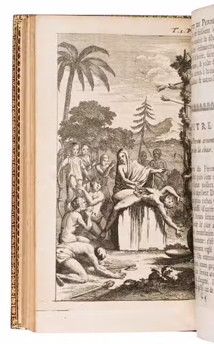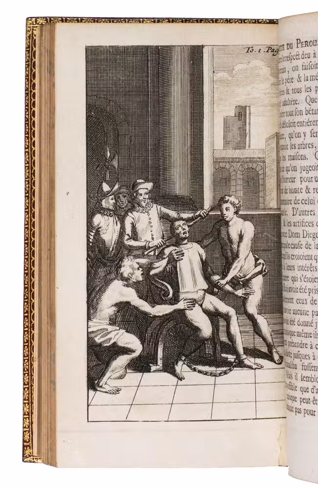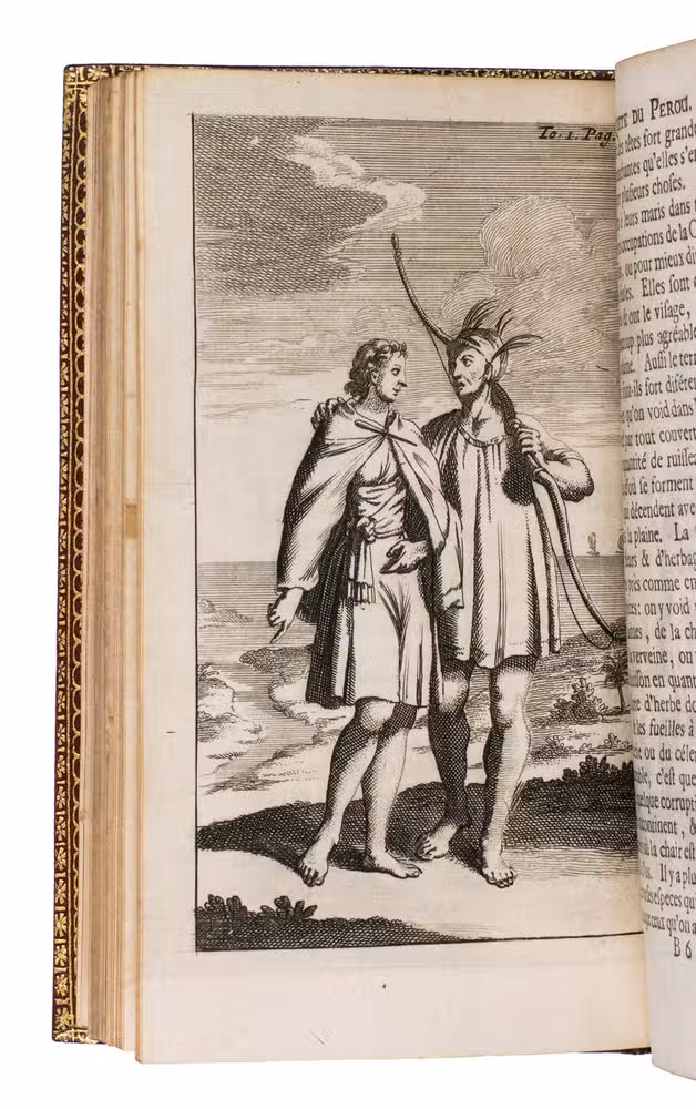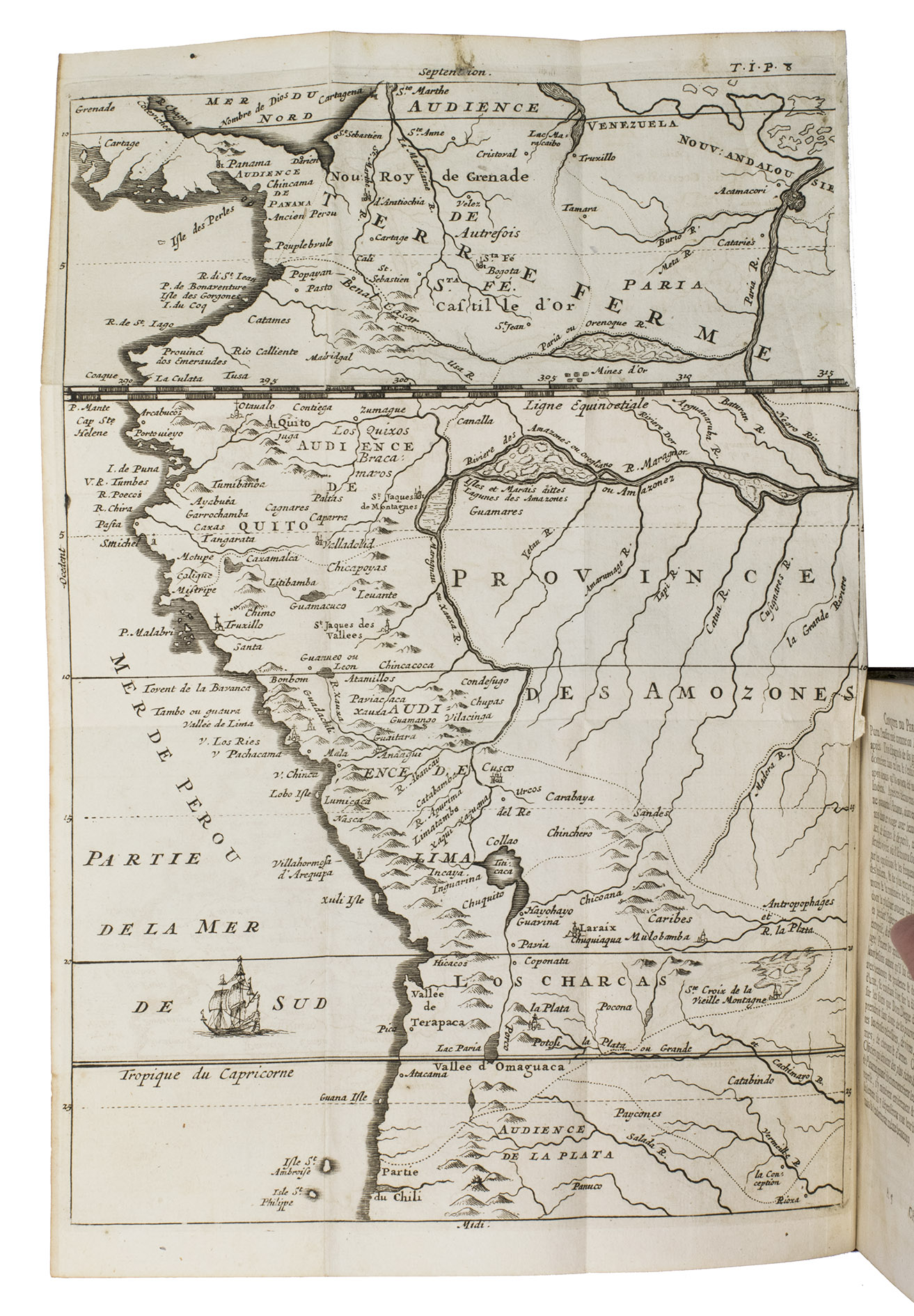 Amsterdam, J. Louis de Lorme, 1700. 2 volumes. 12vo. With an engraved frontispiece, a folding engraved map of Peru, 11 engraved plates, and 2 folding engraved plates. Further with two different woodcut vignettes on the red and black title-pages of both volumes, woodcut decorated initials, woodcut headpieces and headpieces built up from typographical ornaments, and a large ornamental woodcut tailpieces. 18th-century gold-tooled red morocco. [1], [1 blank], [36], 307, (1 blank); [1], [1 blank], [4], 408 pp.