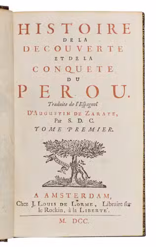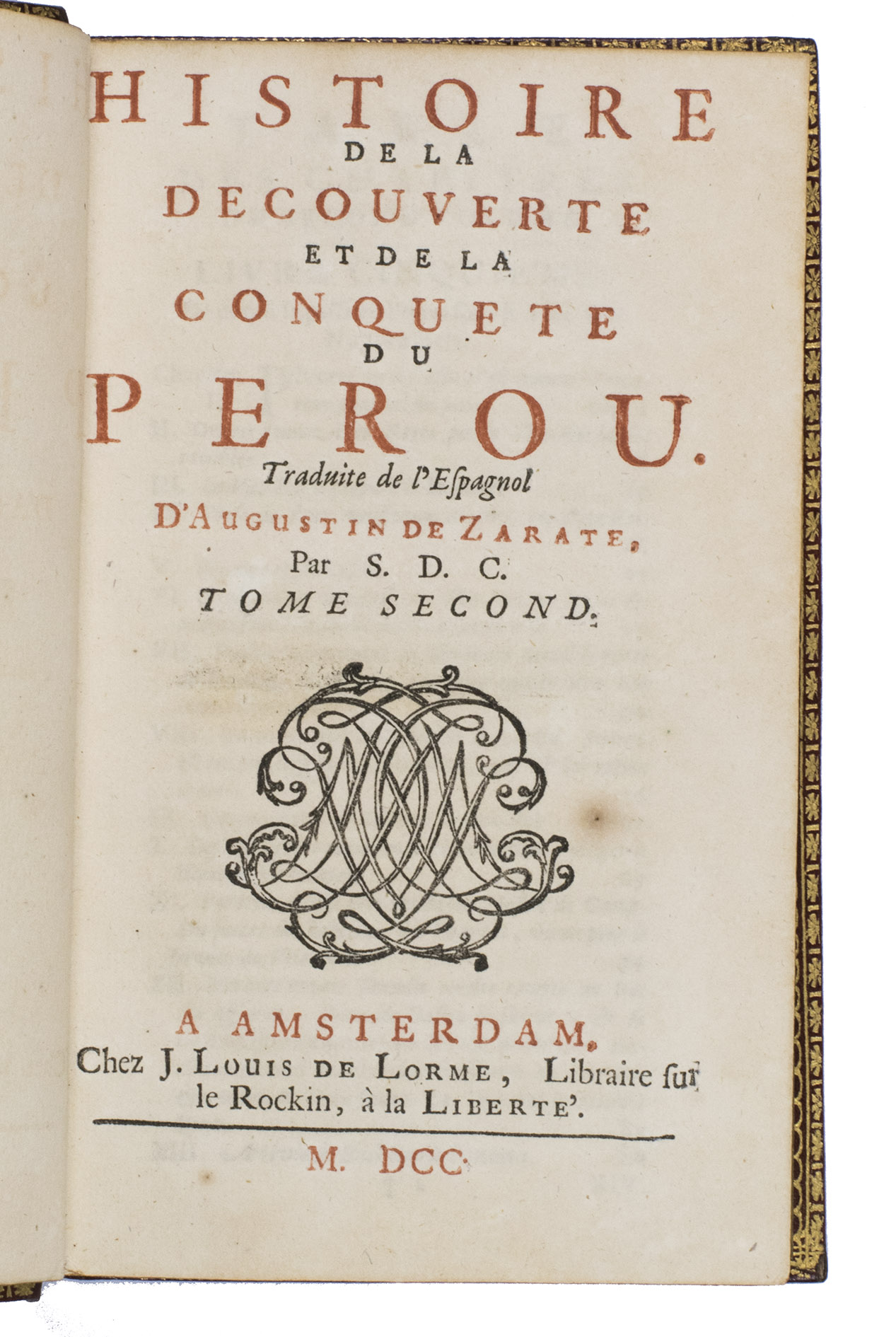 First translation into French of one of the most valuable works on the history of the discovery and conquest of Peru. Augustin de Zarate (1504-1560) was sent out to examine the finacial affairs of Peru. He remained there several years, making notes and collecting material for the present work. He had access to the best official sources of information, and his work is the foundation for later works on the subject. The original Spanish edition was published in Antwerp, 1555.