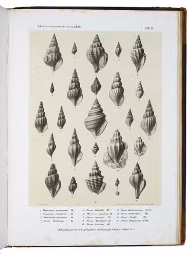 Wien, K. K. Hof- und Staatsdruckerei bei Wilhelm Braumüller, 1852. Folio. With engraved coat-of-arms of the Austrian Empire flanked by two eagles on the title-page and 24 numbered full-page plates of (snail-) shells with more than 400 figures, lithographed by J. Strohmaijer, Zehner, Heinrich Backer and A. Paschinger. Contemporary half calf. [4], 124 pp.