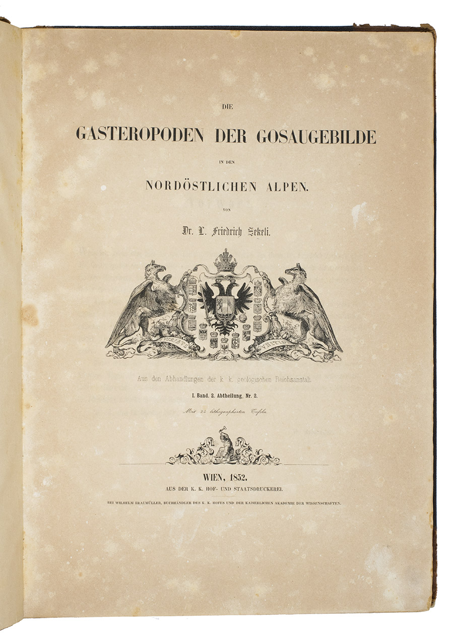 Rare original edition of the thesis ("Habitilation thesis"), previously published as an article in the journal Abhandlungen der k.k. geologischen Reichsanstalt in the same year 1852 by Lukas Friedrich Zekeli (1823-1881), a paleontologist teaching at the University of Vienna. Zekelis career as a paleontologist started after the two troubled years of revolution in 1850 at the k. k. Geologische Reichsanstalt (Imperial Geological Survey of Austria). He soon became a private lecturer due to his ambitions and idealism. This habilitation thesis Die Gasteropoden der Gosau-Gebilde (The Gastropods of the Gosau Beds), his main work, won broad recognition.