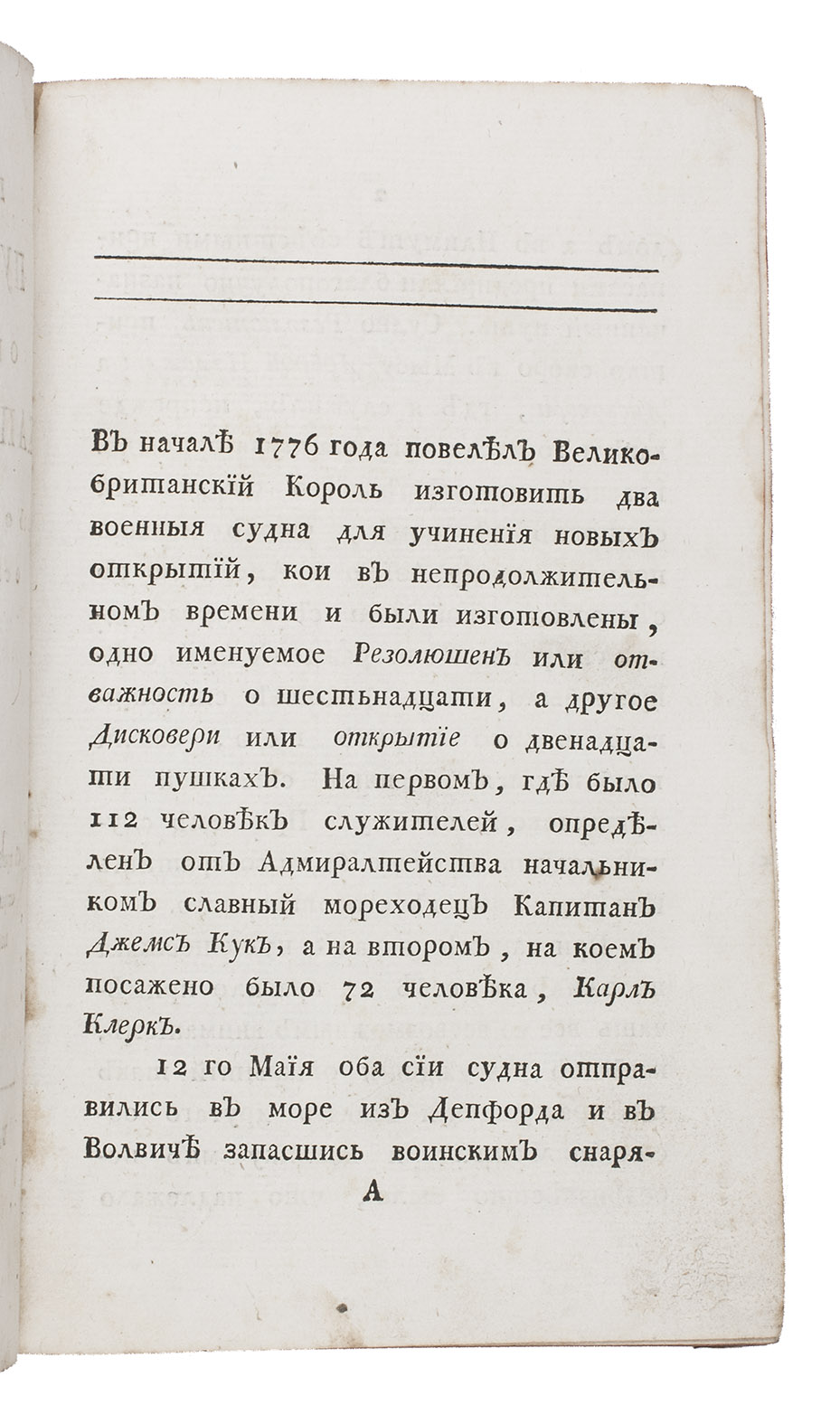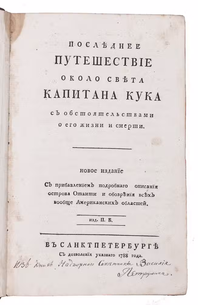 Extremely rare second Russian edition, revised and augmented, of Heinrich Zimmermann's valuable account of Cook's third and final voyage, with a description of Cook's death at Kealakekua Bay, Hawaii. Zimmermann's account is followed by articles on Tahiti, a life of James Cook, and an essay on America in general, abridged from the Akademicheskiia izviestiia for 1781 and not included in the first Russian edition of 1786. Though Cook famously discovered Hawaii during his third voyage, Russian interest centred on his explorations of the American Northwest coast, where Russian fur traders had tried to establish permanent posts since the 1770's. Indeed, the first permanent Russian settlement was established only four years prior to the present publication.