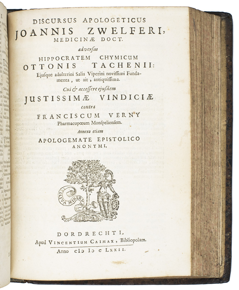 Two works, initially published in two complementary edition and here in a single edition, providing a very sharp critique of the standard German pharmacopoeia. Johann Zwelfer from the Palatinate (1618-1668) worked as an apothecary for 16 years, then studied medicine in Padua. He is first mentioned as the author of the two present works: the Pharmacopoeia regia (vol. 2), and his critical corrections to and commentary on the standard German pharmacopoeia, Pharmacopoeia Augustana (vol. 1). Both were first published in Vienna in 1652 and further editions appeared at Gouda (1658) and Nürnberg (1668) before the present rare Dordrecht edition.