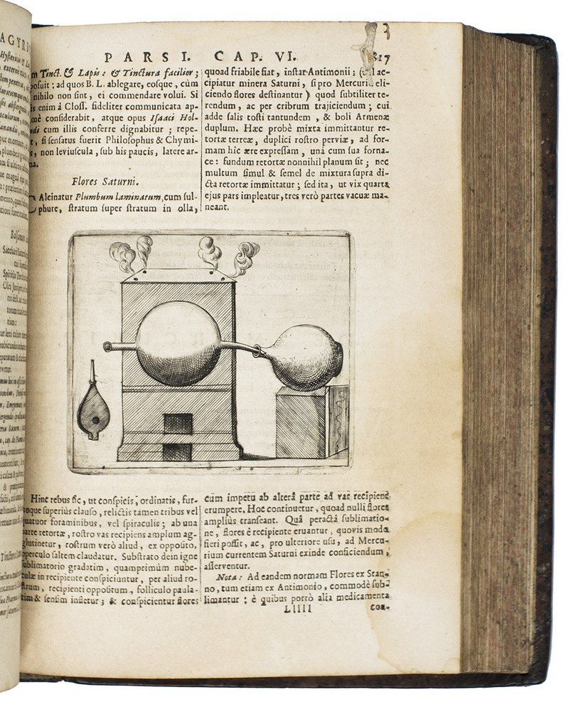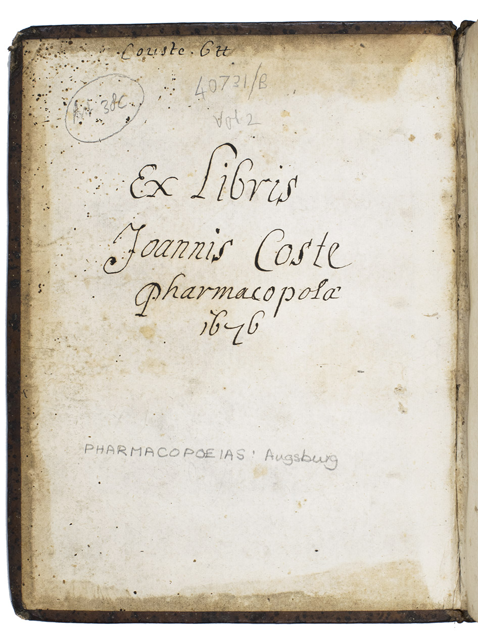 Each volume with an owners inscription of Joannis Coste, Pharmacopolae 1676, as well as a library stamp of the Wellcome Library (incl. their cancellation stamp). Lacking the engraved frontispiece in vol. 1 and with wormholes in the margins of vol. 2, sometimes affecting the text. Front hinge of vol. 1 weak. Otherwise in good condition. Jocher, Allgemeines Gelehrten-Lexicon IV (1751), 2141; J. R. Partington, A history of chemistry II, pp. 292, 296-297; Ferguson II, p. 572; Hirsch/H V, 1055; Ferchi 598; Hein/Schwartz II, 787; Scherer, Literatura pharmacopoearum 418d.