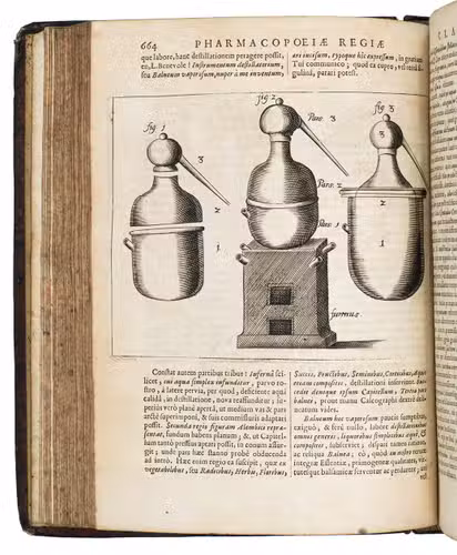 Each volume with an owners inscription of Joannis Coste, Pharmacopolae 1676, as well as a library stamp of the Wellcome Library (incl. their cancellation stamp). Lacking the engraved frontispiece in vol. 1 and with wormholes in the margins of vol. 2, sometimes affecting the text. Front hinge of vol. 1 weak. Otherwise in good condition. Jocher, Allgemeines Gelehrten-Lexicon IV (1751), 2141; J. R. Partington, A history of chemistry II, pp. 292, 296-297; Ferguson II, p. 572; Hirsch/H V, 1055; Ferchi 598; Hein/Schwartz II, 787; Scherer, Literatura pharmacopoearum 418d.